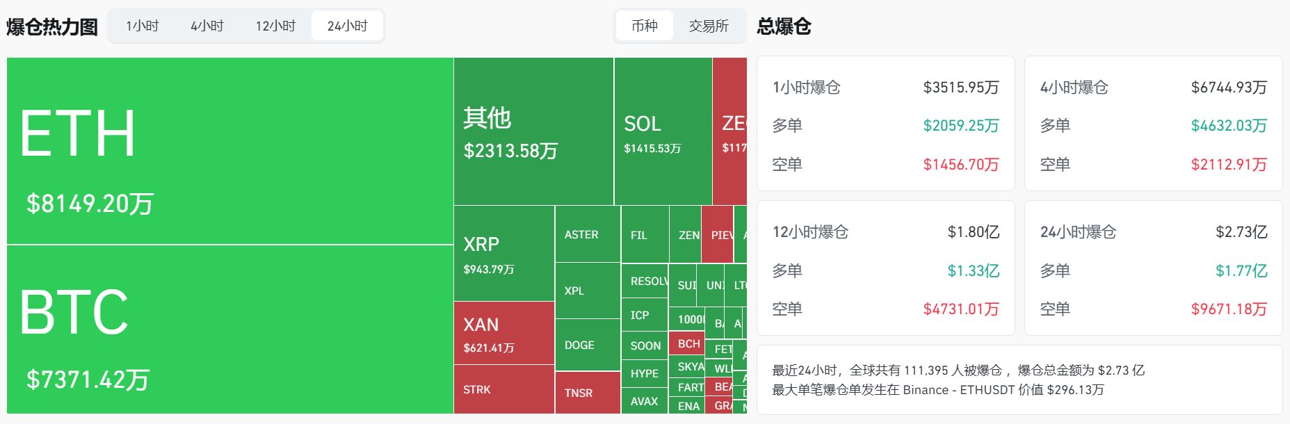 BTC 爆仓金额达 7371.42 万美元,ETH 爆仓 8149.20 万美元。过去 24 小时内共有 111,395 人被爆仓,最大单笔爆仓出现在 Binance 的 ETHUSDT 交易对上,价值 296.13 万美元。
