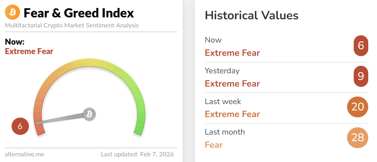 深潮 TechFlow 消息,2 月 7 日,据 Alternative.me 数据,今日加密货币恐慌与贪婪指数降至 6(昨日该指数为 9),表明市场仍处于「极度恐慌状态」。