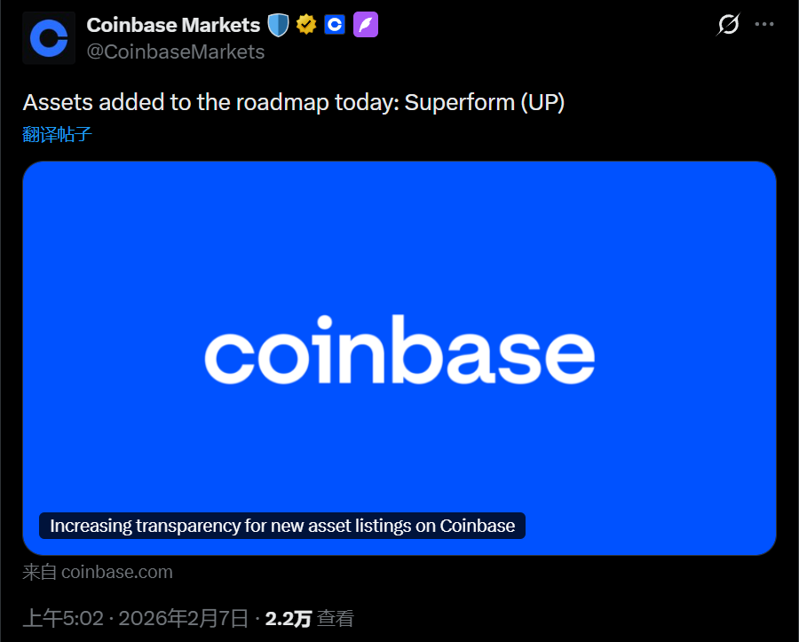 深潮 TechFlow 消息,2 月 7 日,据官方公告,Coinbase 今晨宣布将 Superform(UP)加入上币路线图,满足相关条件后将另行公布具体上线时间。