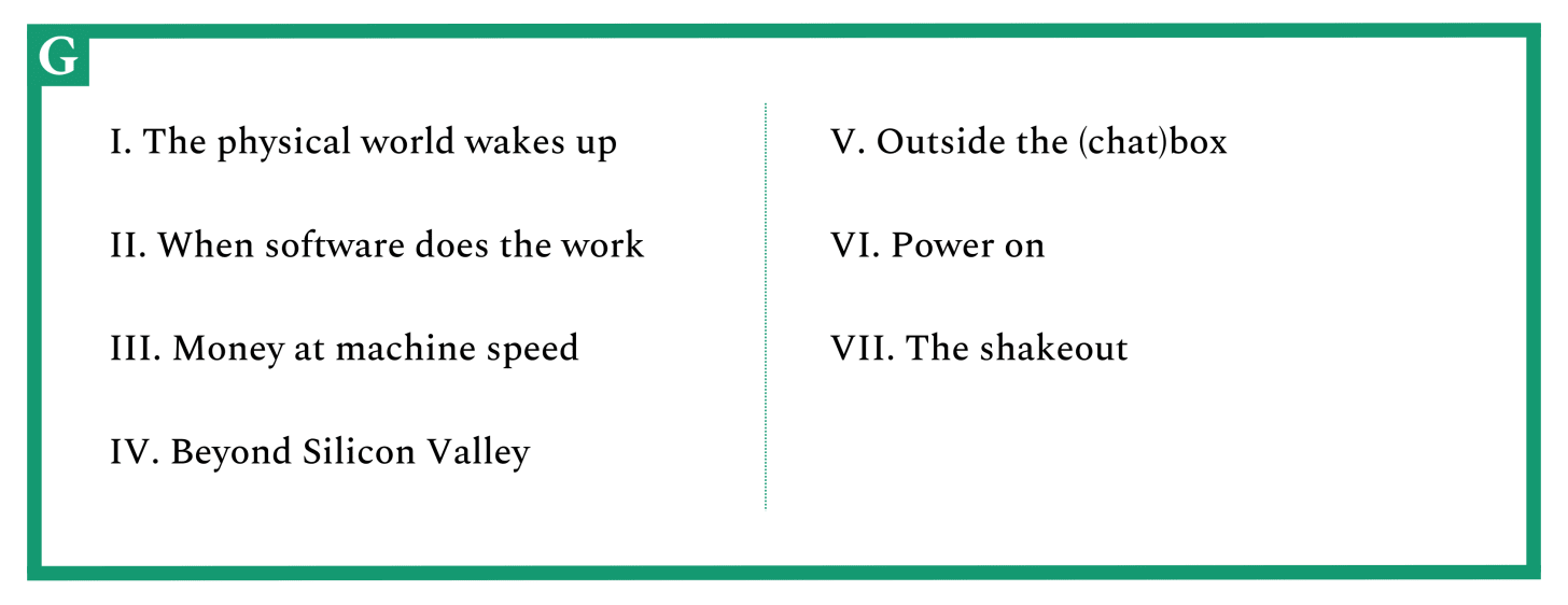 Below, you will find their answers, organized into seven themes. It includes entries from legends like Reid Hoffman, Kirsten Green, Gili Raanan, and Aydin Senkut, as well as those I consider the sharpest thinkers from the next generation. It is, in a sense, a collection of futures. A cadre of possible paths that may or may not unfurl. In big and little ways, I hope that they make you a little more aware of what may happen and where opportunities might lie.