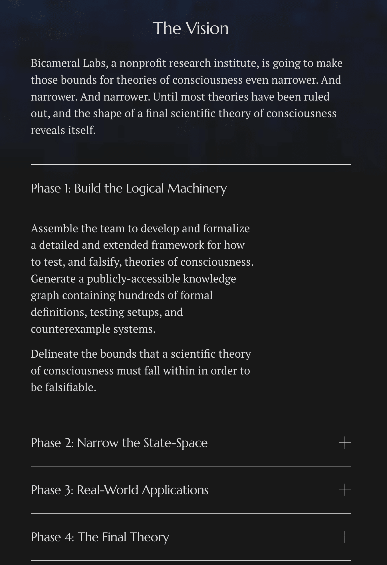 Why do this as a nonprofit research institute? I’ve worked in academia (on and off) for a long time now. It’s not that funding for such ideas is completely impossible—my previous research projects have been funded by sources like DARPA, the Templeton Foundation, and the Army Research Office. But for this, academia is mismatched. It’s built around one-off papers, citation metrics, small-scale experiments run in a single lab, and looking to the next grant. To solve consciousness, we need a straight shot all the way through to the end.