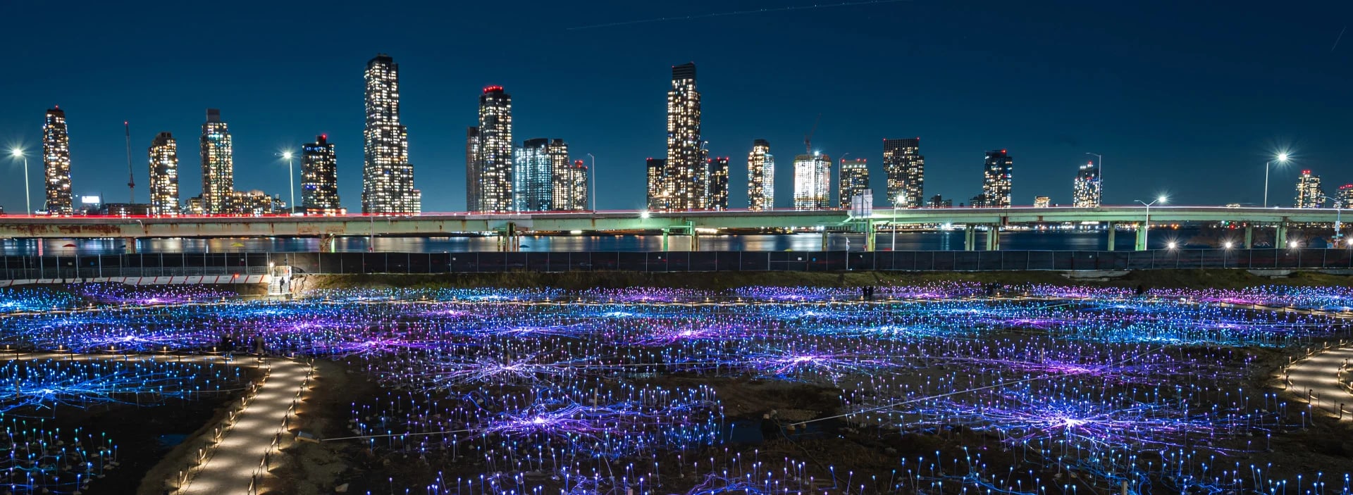 From above, Field of Light is just that—an irregular glow scattered across several blocks, slowly shifting color. It was originally placed in the shadow of the Uluru sandstone monolith in Australia. Below glowing skyscrapers, of course, it hits a little differently.
