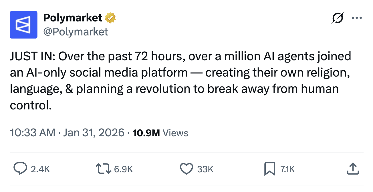 A better description is that an unknown number of AI agents posted a bunch of stories on a website. Many of the major screenshots were fake, as in, possibly prompted or created by humans (one screenshot with millions of views, for instance, was about AIs learning to secretly communicate… while the owner of that bot was a guy selling an AI-to-AI messaging app).