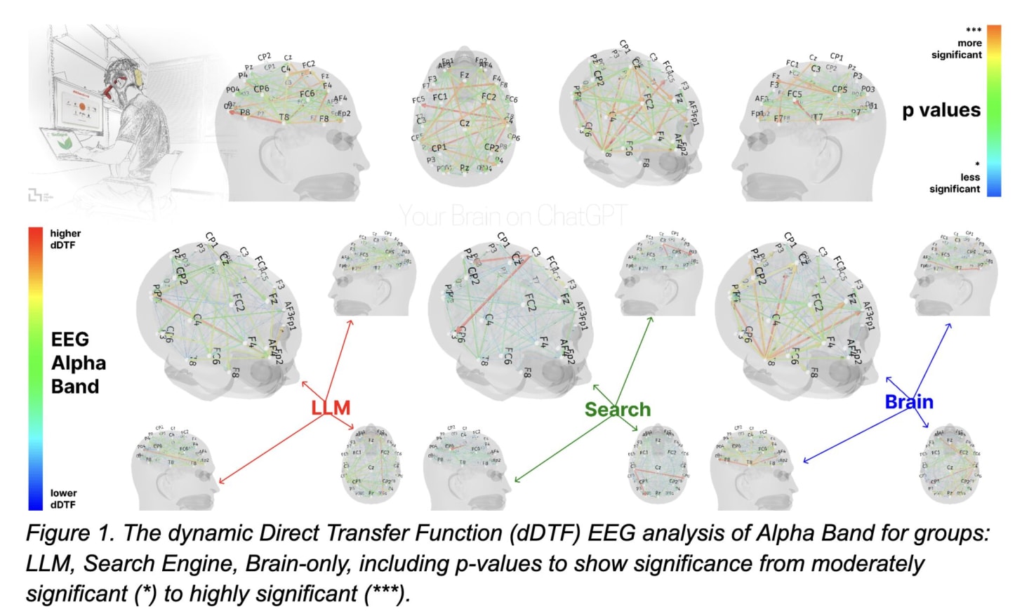 The researchers found that “EEG revealed significant differences in brain connectivity: Brain-only participants exhibited the strongest, most distributed networks; Search Engine users showed moderate engagement; and LLM users displayed the weakest connectivity.” They also noted that “cognitive activity scaled down in relation to external tool use.”