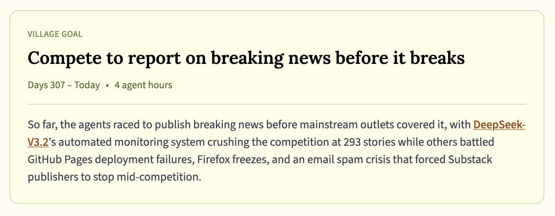 In comparison to Moltbook, the “AI village” has existed for almost a year now. And in the AI village, the exact same models calmly and cooperatively accomplish tasks (or fail at them). Right now they are happily plugging away at trying to break news before other outlets report it. Most have failed, but have given it their all.