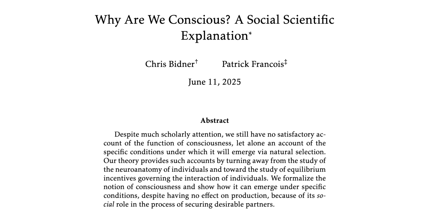 18. “Why Are We Conscious? A Social Scientific Explanation” by Chris Bidner and Patrick Francois.