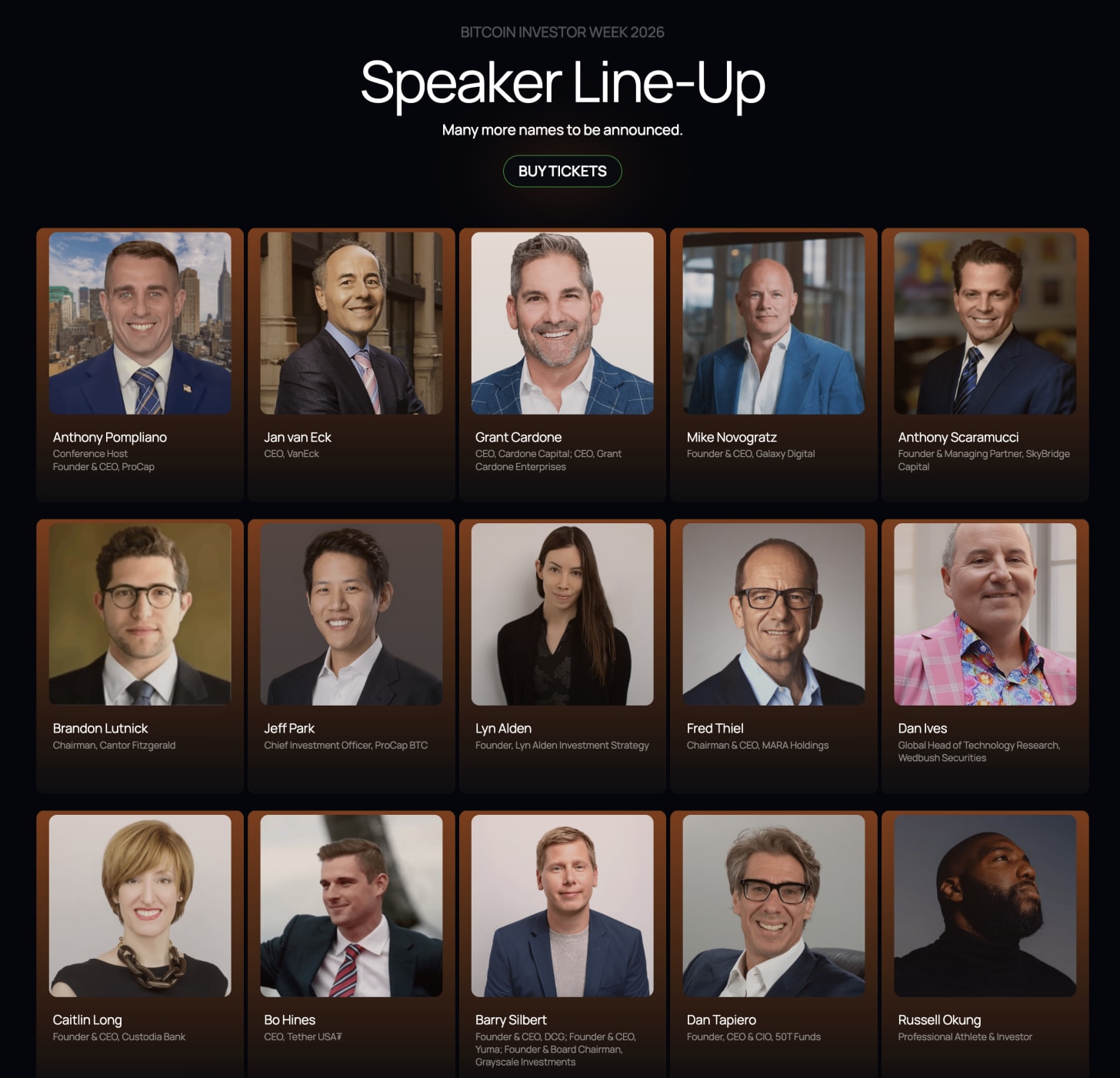 Expect fireside chats, panels, networking events across the city and a top lineup of speakers including Mike Novogratz, Grant Cardone, Anthony Scaramucci, Jan van Eck, Fred Thiel, Lyn Alden, Jeff Park, and Bo Hines — with more announcements coming soon.
