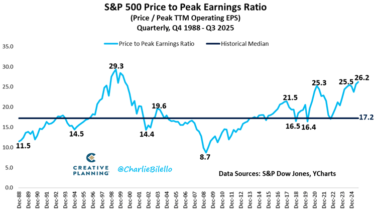 Historically, the introduction of QE has been very bullish for investors. But this policy shift is happening at a very interesting time. Creative Planning’s Charlie Bilello writes “investors are now paying 26.2 times peak S&P 500 earnings, the highest valuation we’ve seen since 2000 and over 50% above the historical median. A decade ago this same ratio was at 16.8.”