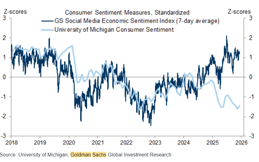 But as the Wall Street Journal’s Gunjan Banerji recently pointed out, the Goldman Sachs Social Media Economic Sentiment Index has diverged in a big way from the Consumer Sentiment Survey.