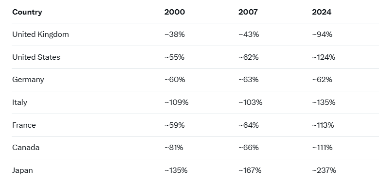 The United States’ debt-to-GDP has exploded from about 55% in the year 2000 to nearly 125% in 2024. We are addicted to debt. There is no other way to describe the situation.