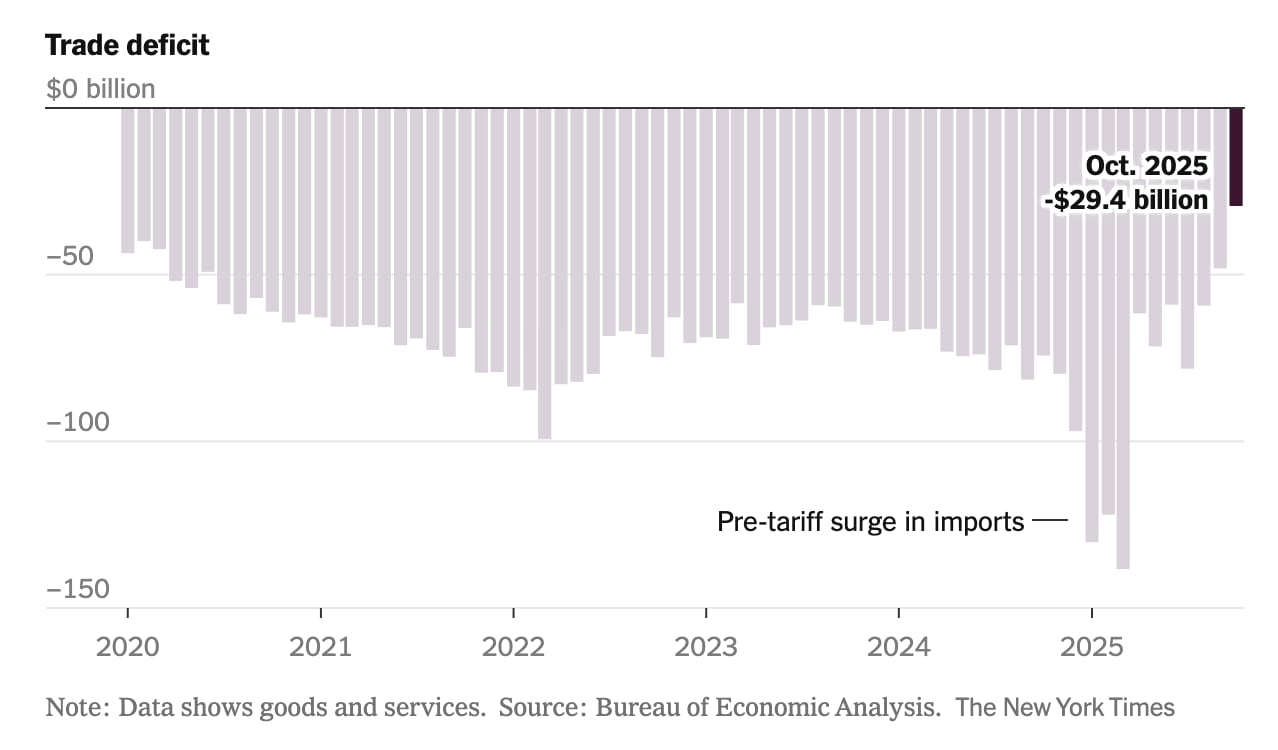 “The U.S. trade deficit in goods and services shrank to $29.4 billion in October, down from $48.1 billion the prior month as the Trump administration’s tariffs reshaped global trade, data from the Commerce Department showed on Thursday.