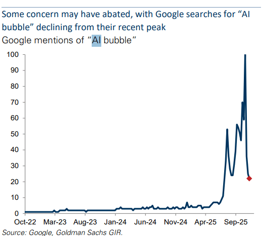 It isn’t just social media though. Mike Zaccardi shows Google searches for “AI bubble” have started declining from their recent peak.