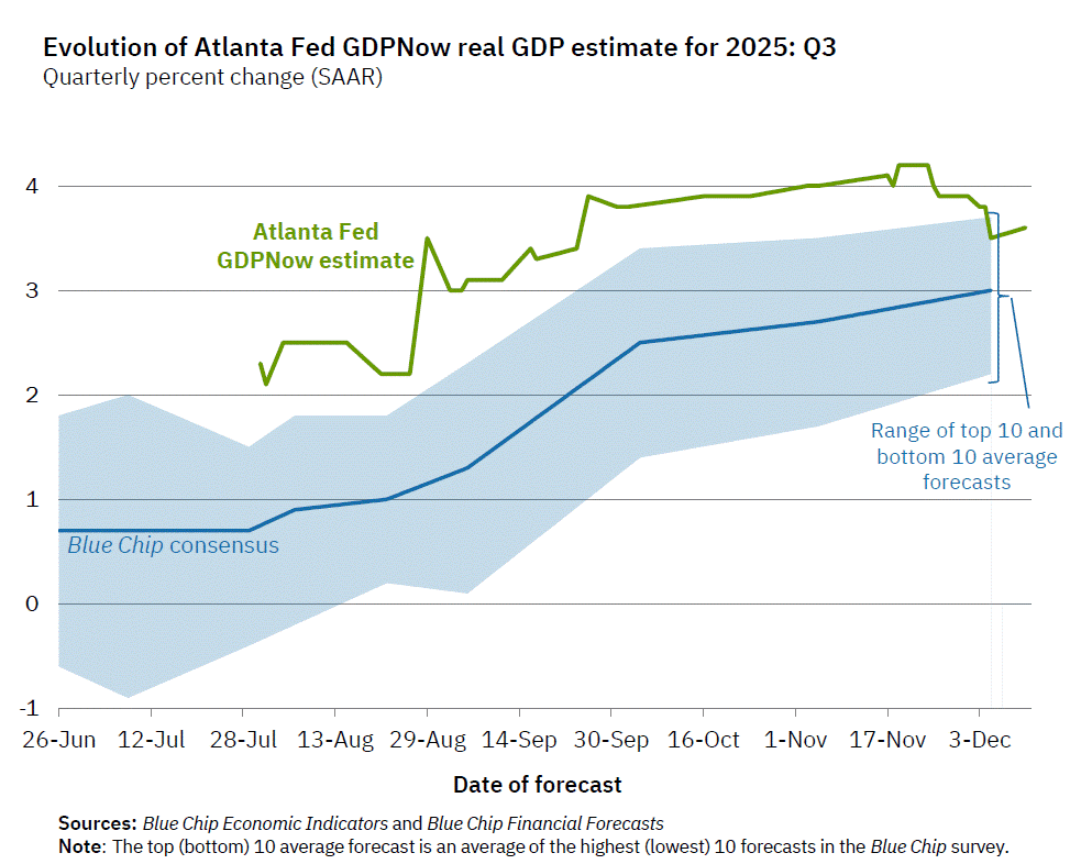 E.J. Antoni explains the Atlanta Fed now has the “Q3 GDP estimate increased to 3.6% as exports revised higher, offsetting downward revisions to investment and government. It’s very good news that government purchases might come in flat for the first 9 months of 2025 - that’s incredible progress.”