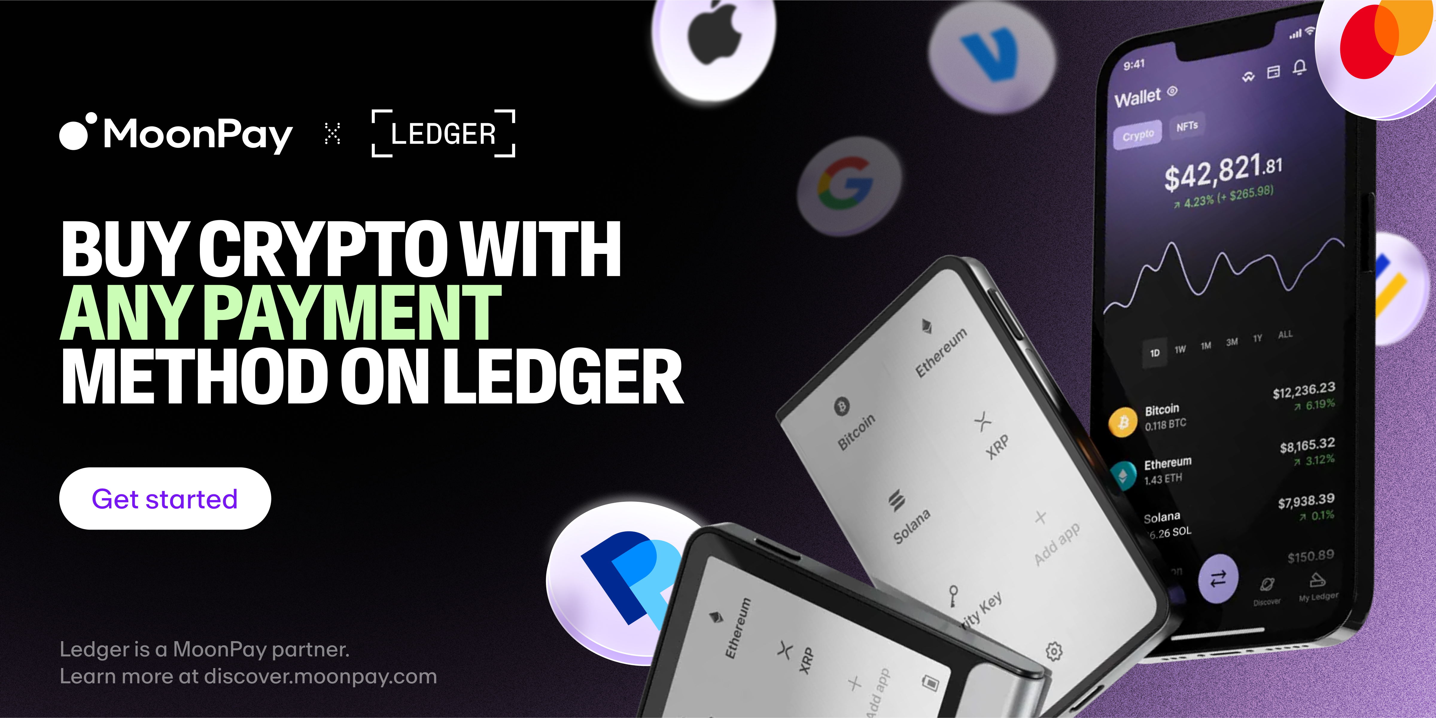 Buy crypto instantly with the world’s most trusted hardware wallet, powered by MoonPay. Use your card, Apple Pay, PayPal, Venmo, or bank transfer directly in your Ledger Live.
