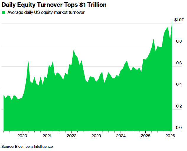 “U.S. equity markets are seeing record turnover, averaging $1.03 trillion a day in January—a 50% jump from a year ago—with 19 billion shares traded daily.