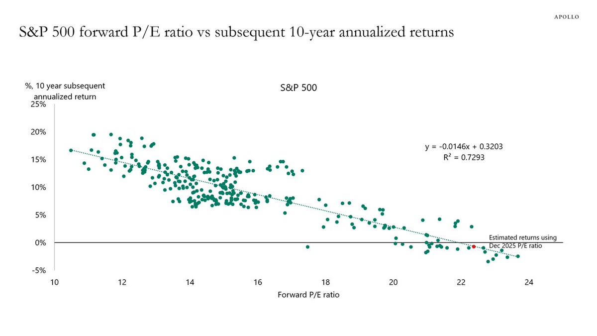 Mike Zaccardi and Torsten Slok show “the historical relationship between the S&P 500 forward P/E ratio and subsequent 10-year annualized returns shows that investors should expect to get zero in return in the S&P 500 over the coming decade.”