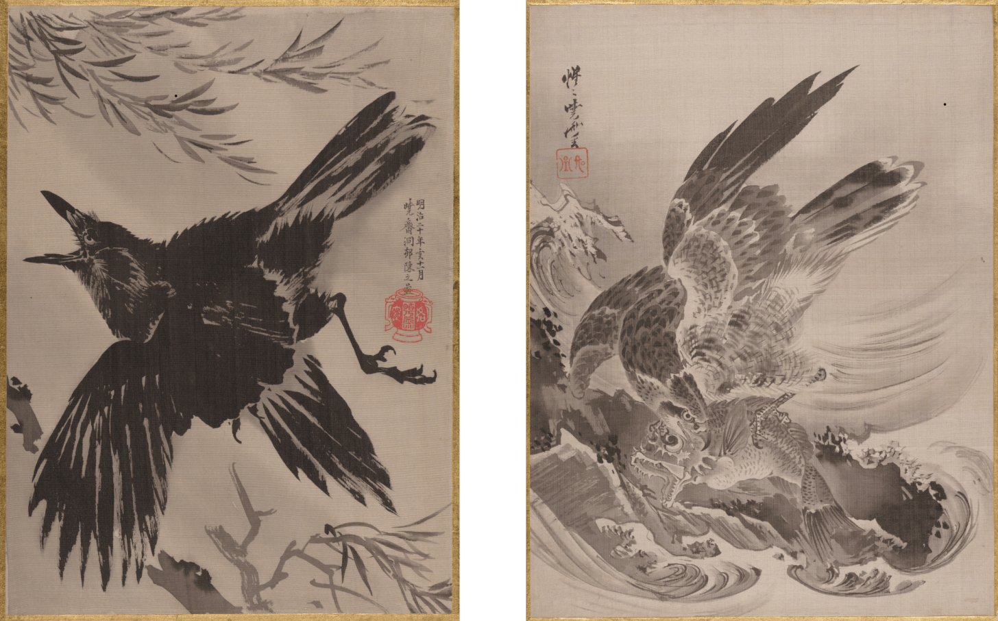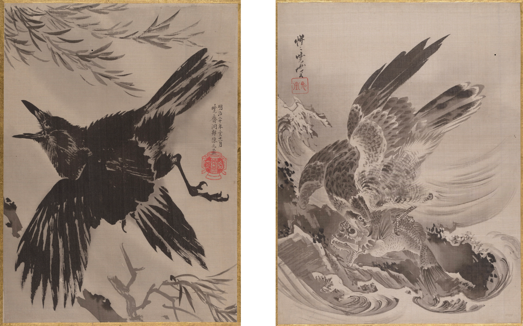 What better subjects to express liberation and motion? Kyōsai’s soaring eagles, ravens, and songbirds share their substance with moving, changing water and buoyant leaves. Their bodies are as free and flexible as the wind. Air passes through their feathers.