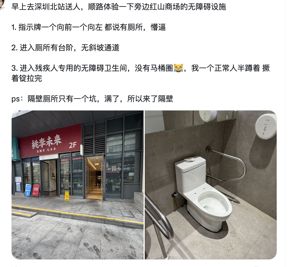 各种大楼的无障碍设施也有很多形同虚设,有的被铁门锁住了,有的年久失修。有的坡道完美无缺,但是从市政道路跟本过去不去。无障碍厕所也是,长年被锁的,缺少零件的,也比比皆是。