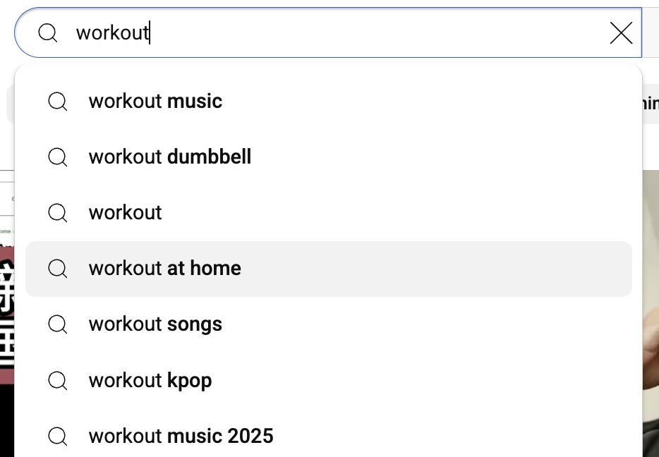 当你输入一个词时,YouTube 会根据真实用户的搜索行为给出推荐。