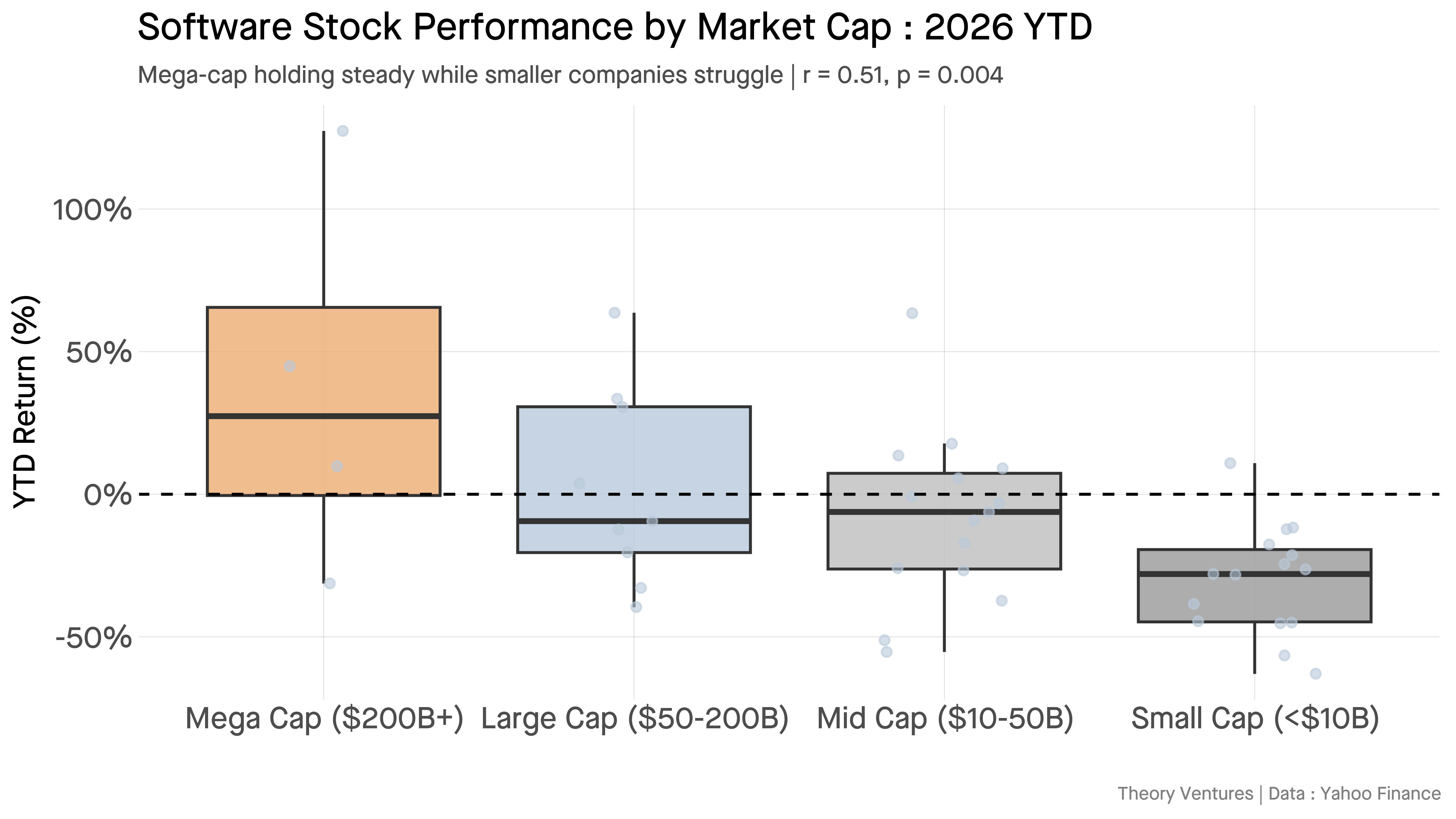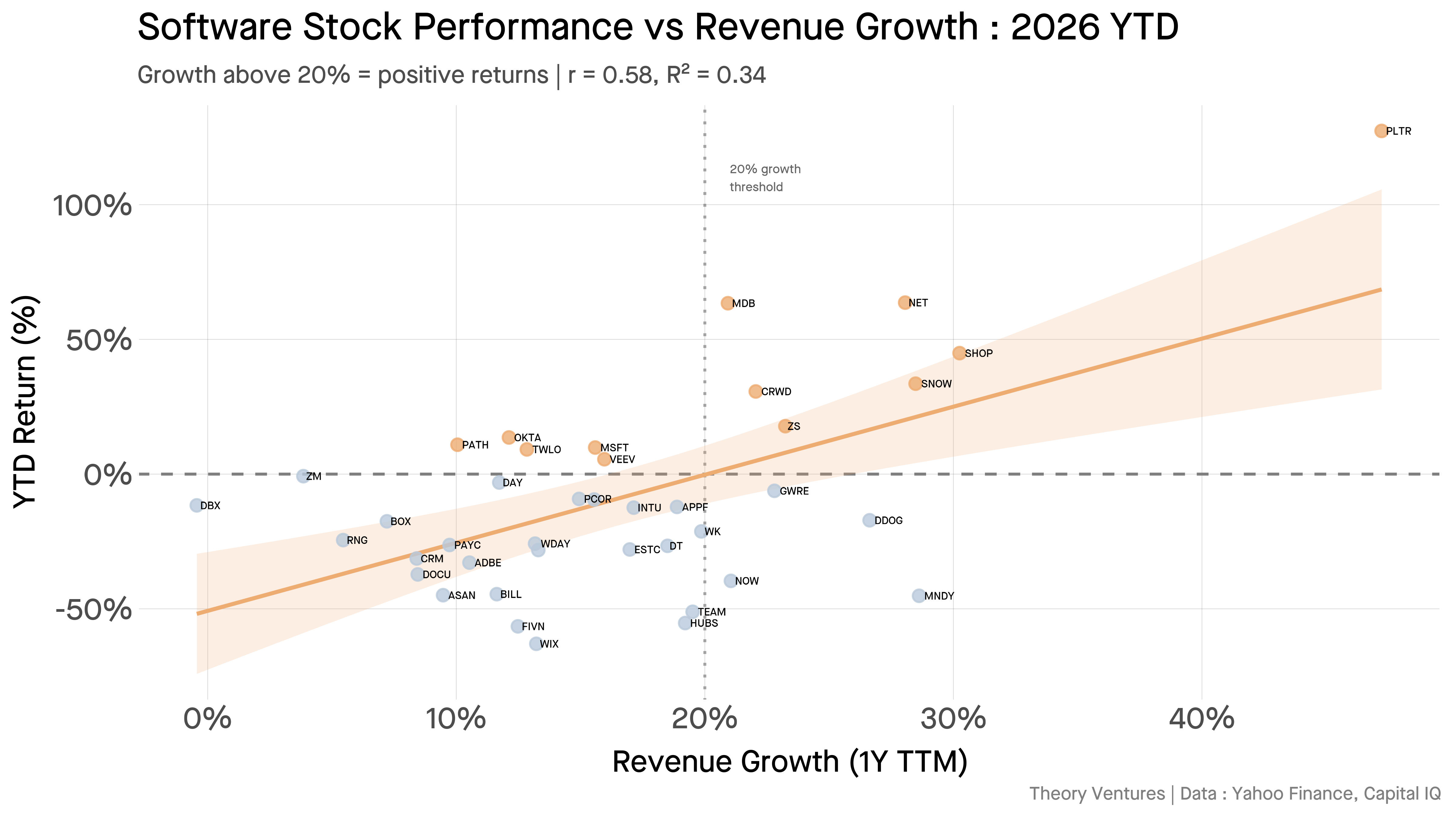 Revenue growth predicts returns better than margins, profitability, or market cap. Companies growing above 20% are up. Companies growing below 20% are down. Palantir grows 47%. MongoDB grows 21%. Adobe & Salesforce grow less than 10%.