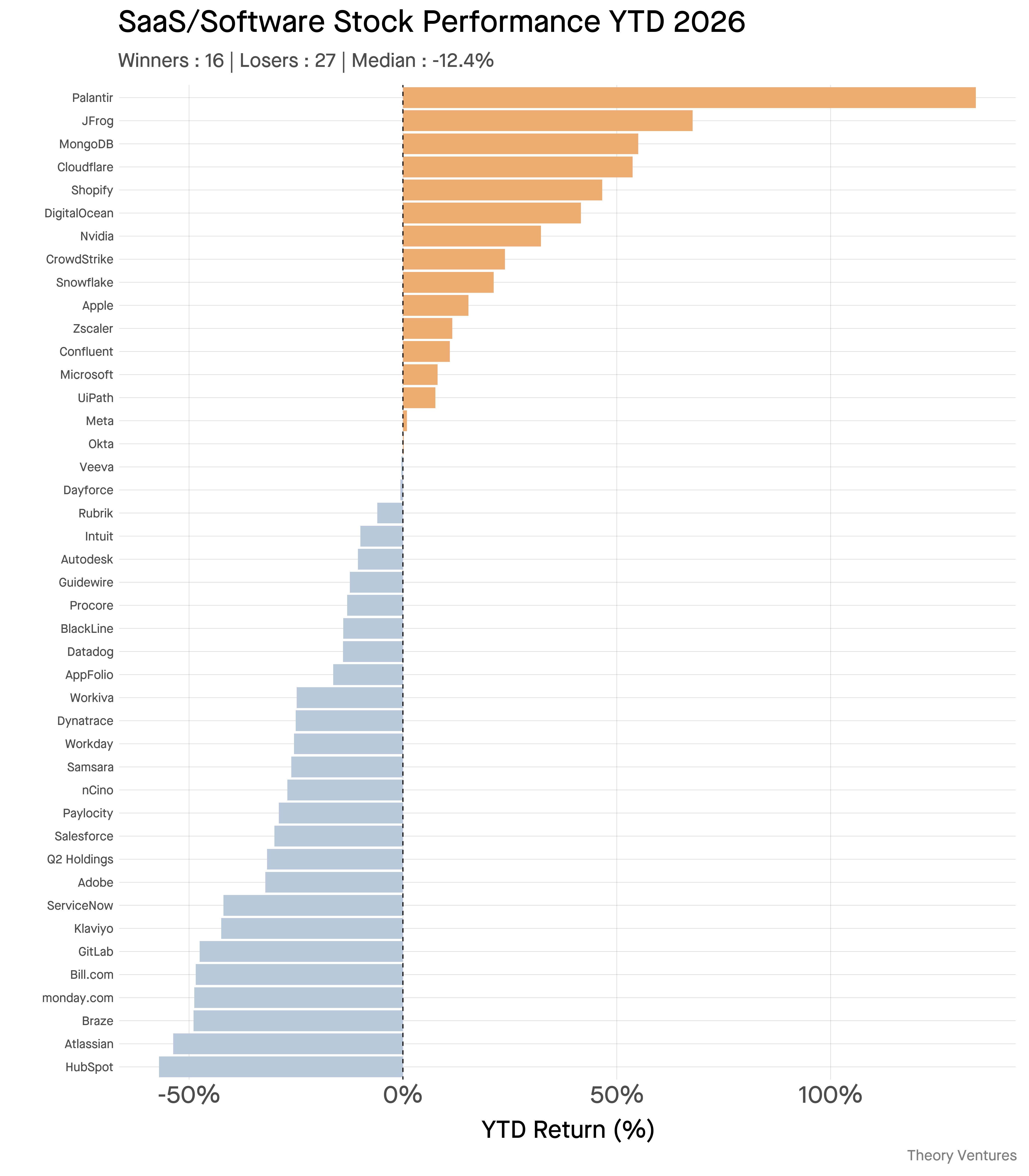 The median SaaS stock is down 14-17% year to date. 64% of software companies are down. Adobe has fallen 32%, HubSpot 57%, Atlassian 54%.