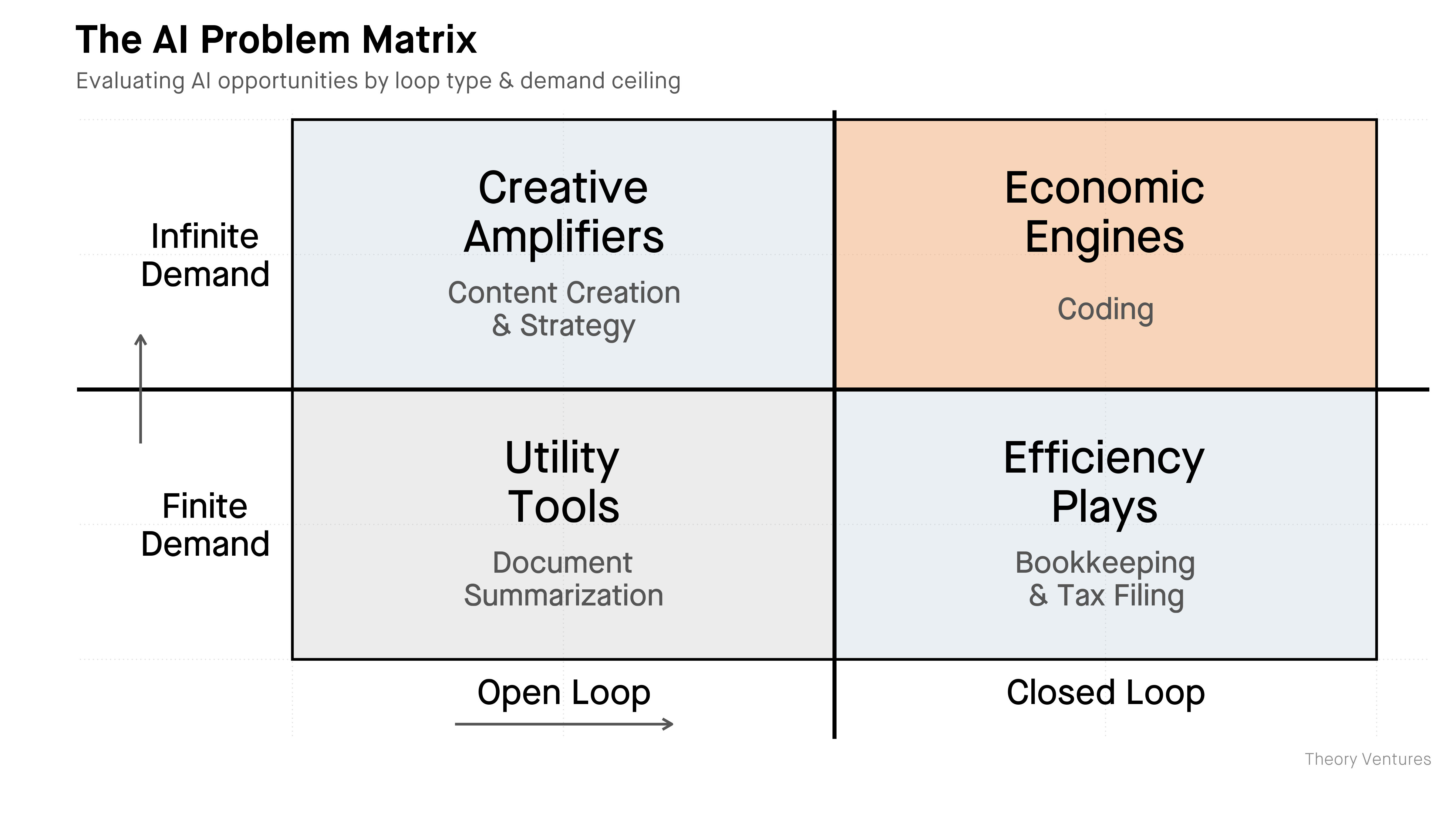 Open Loop + Finite Demand = Utility Tools. Preparing 10-Ks & 10-Qs. Legal contract review. Insurance claims processing. One report per quarter, one contract per deal. AI makes the work faster, but doesn’t create new work to do.