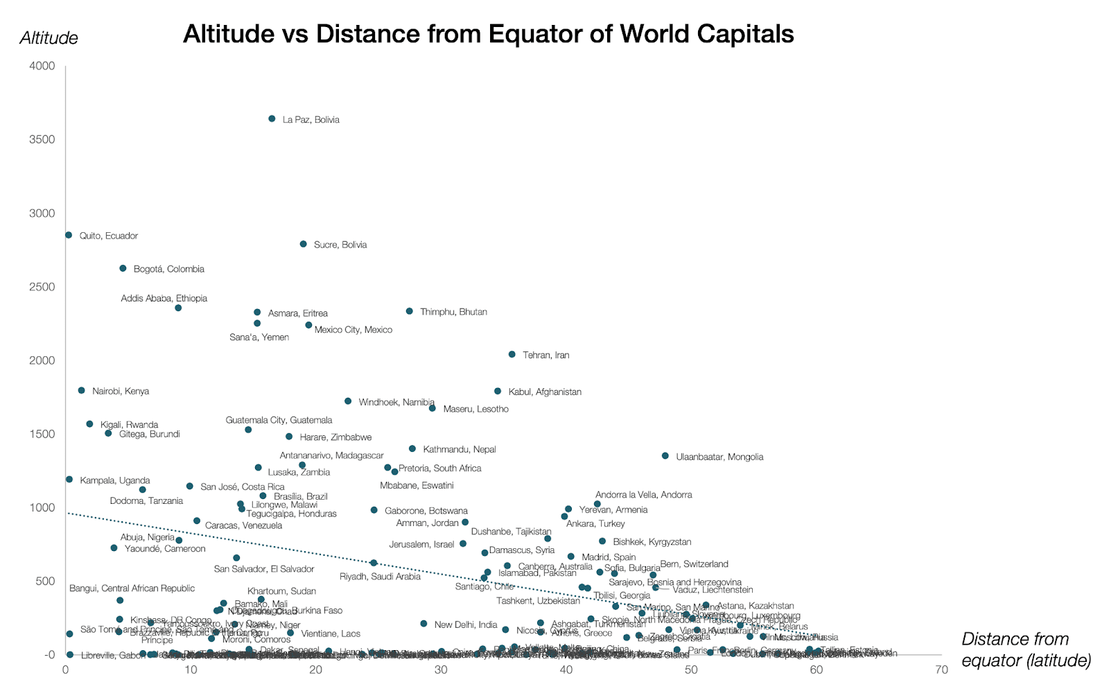 But if you look at the altitude and distance from the equator of the capitals of the world, a clear pattern emerges: