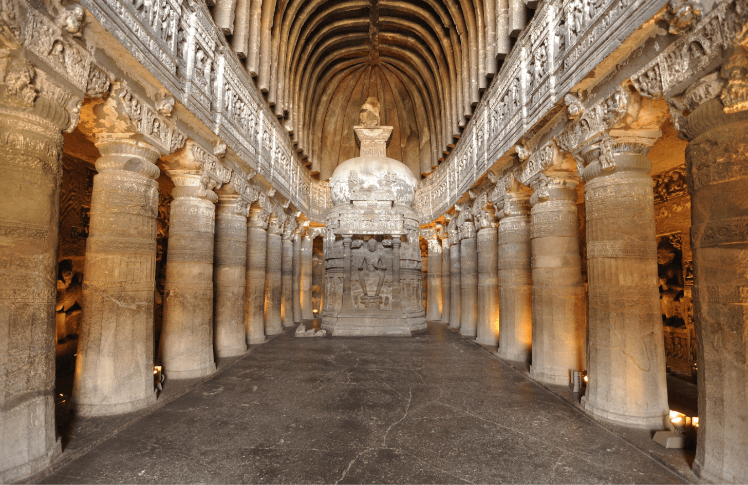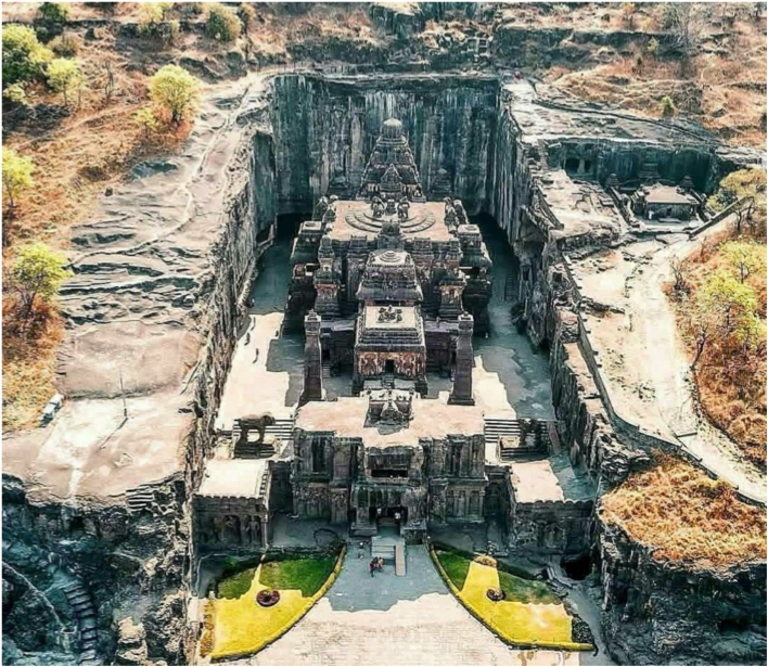 There are also temples carved into stone from the ground. They are not built by adding material, but by subtracting. In the case above, it’s carved inside a mountain from the Deccan, a massive volcanic plateau made of basalt. It can be extremely hard, but here it has joints and planes that can be exploited for carving.