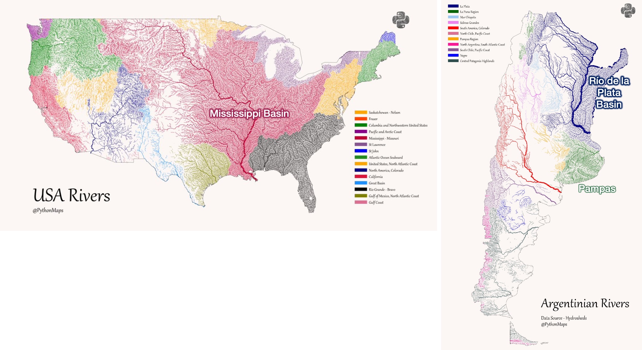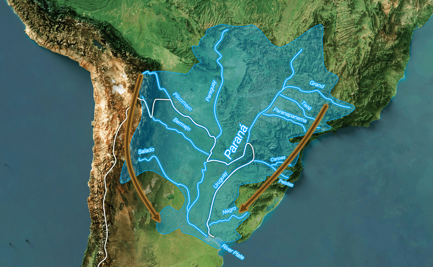 Also, whereas the Mississippi Basin irrigates the US Midwest, the Rio de la Plata Basin doesn’t irrigate the Pampas, which must rely mostly on rain for agriculture.