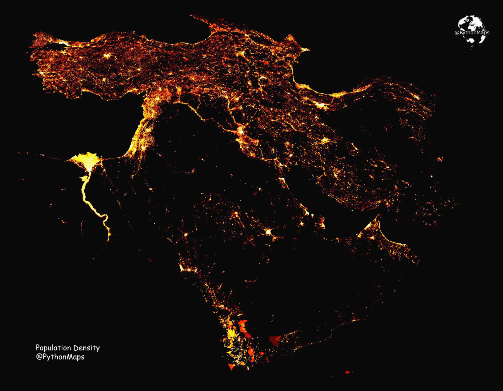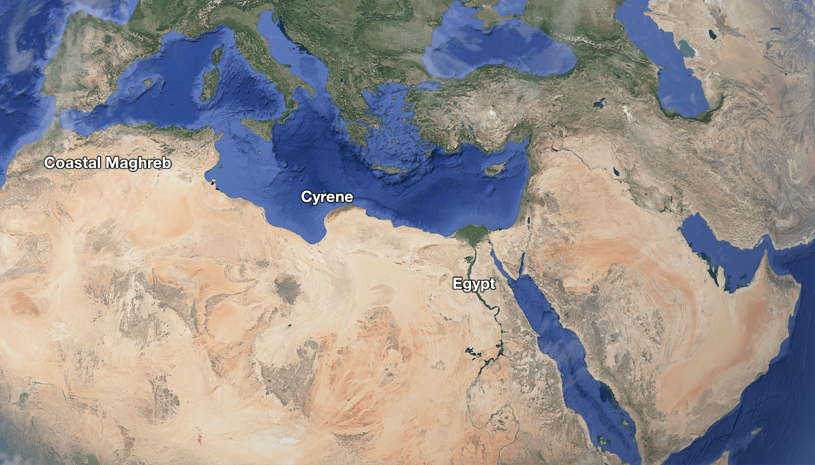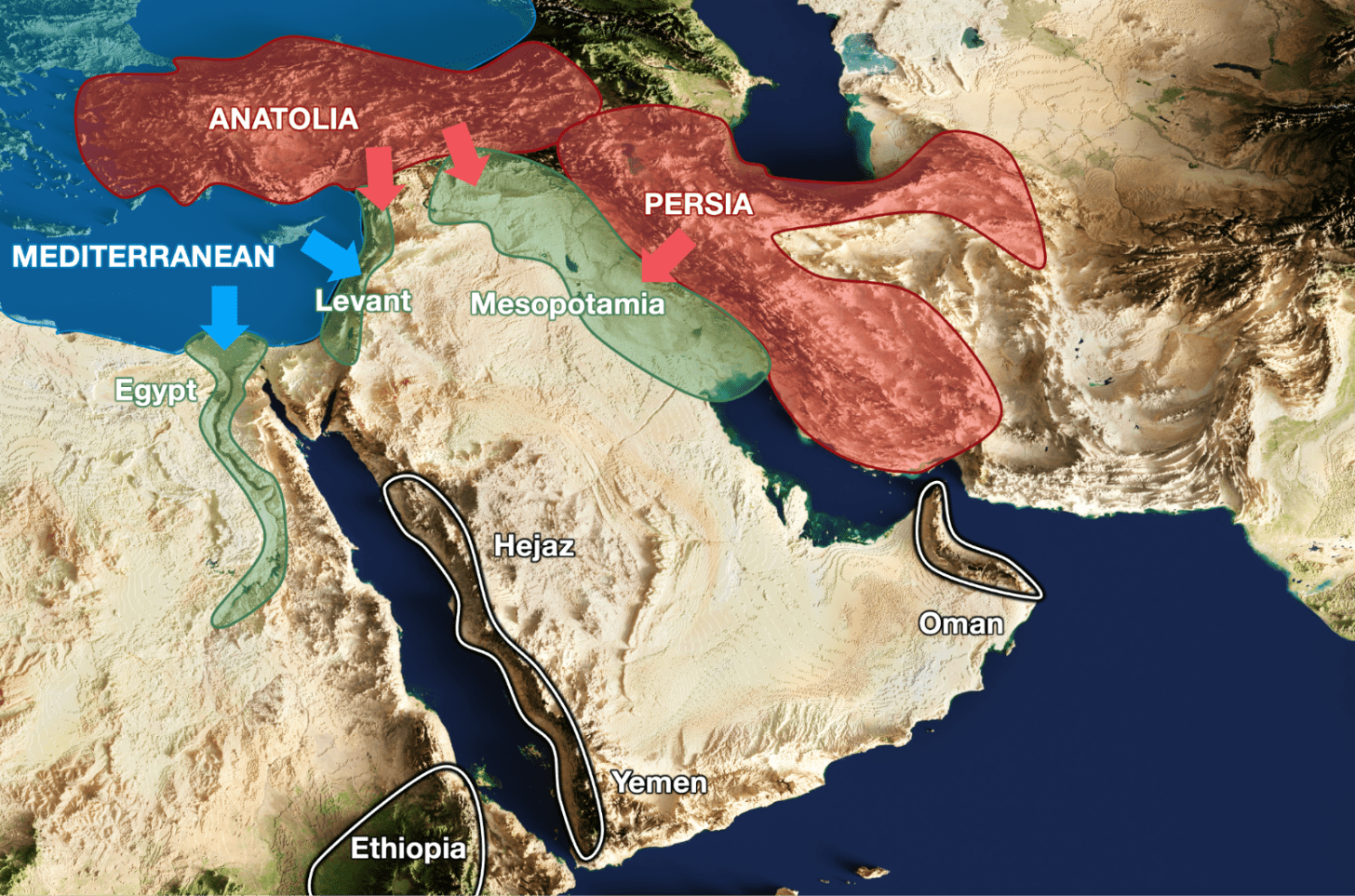 Just north of that, the same phenomenon, but the water from the Mediterranean forms the Levant, with present-day Israel, Palestine, Lebanon, and Syria.