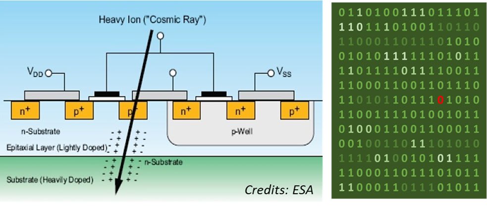 One of the issues is that electromagnetic rays flip bits and cause havoc in existing systems. For example, imagine that a computer has the following number: 1000001000001, which in decimal is 4161. If that first bit receives a solar ray and flips to 0, that number is now 0000001000001, which in decimal is 65. Imagine that you’re calculating 4161*10 and instead of getting 41,610, you get 650. Every downstream calculation will be monumentally off. Catastrophe! As a result, computers in space today require electromagnetic shields that add to their weight.