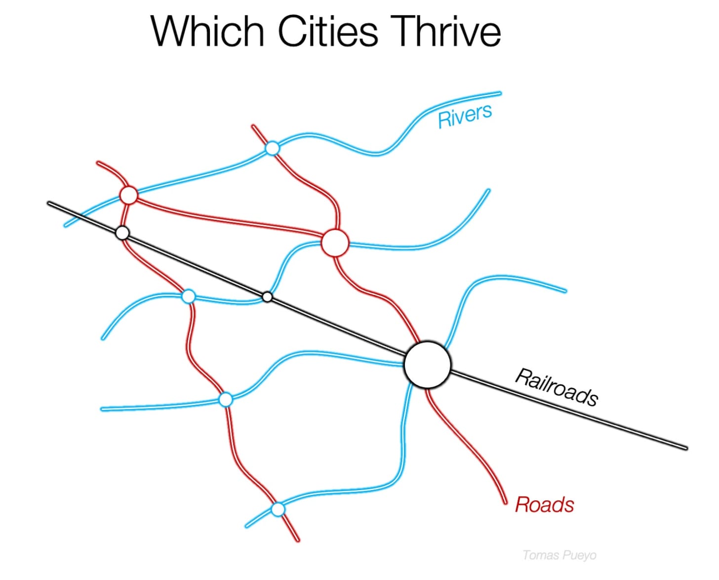 In other words, the key factor that made a city grow a lot was being at the crossroads of cheap transportation lines. We see this in virtually all the cities I’ve covered.