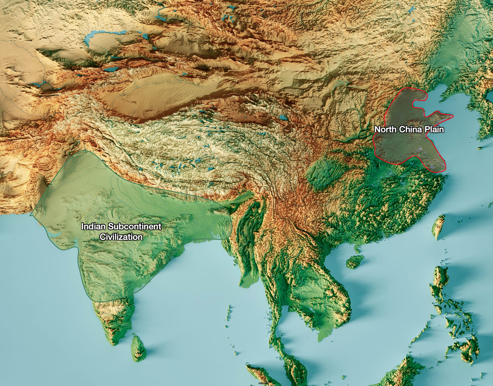 India’s civilization emerged across the Indus and Ganges River Valleys, which have access to sandstone (e.g. in Rajasthan). It also spread quickly across the Deccan Plateau—the mountains in the center—where stone is available, which is very useful to avoid rot and insulate against the heat.