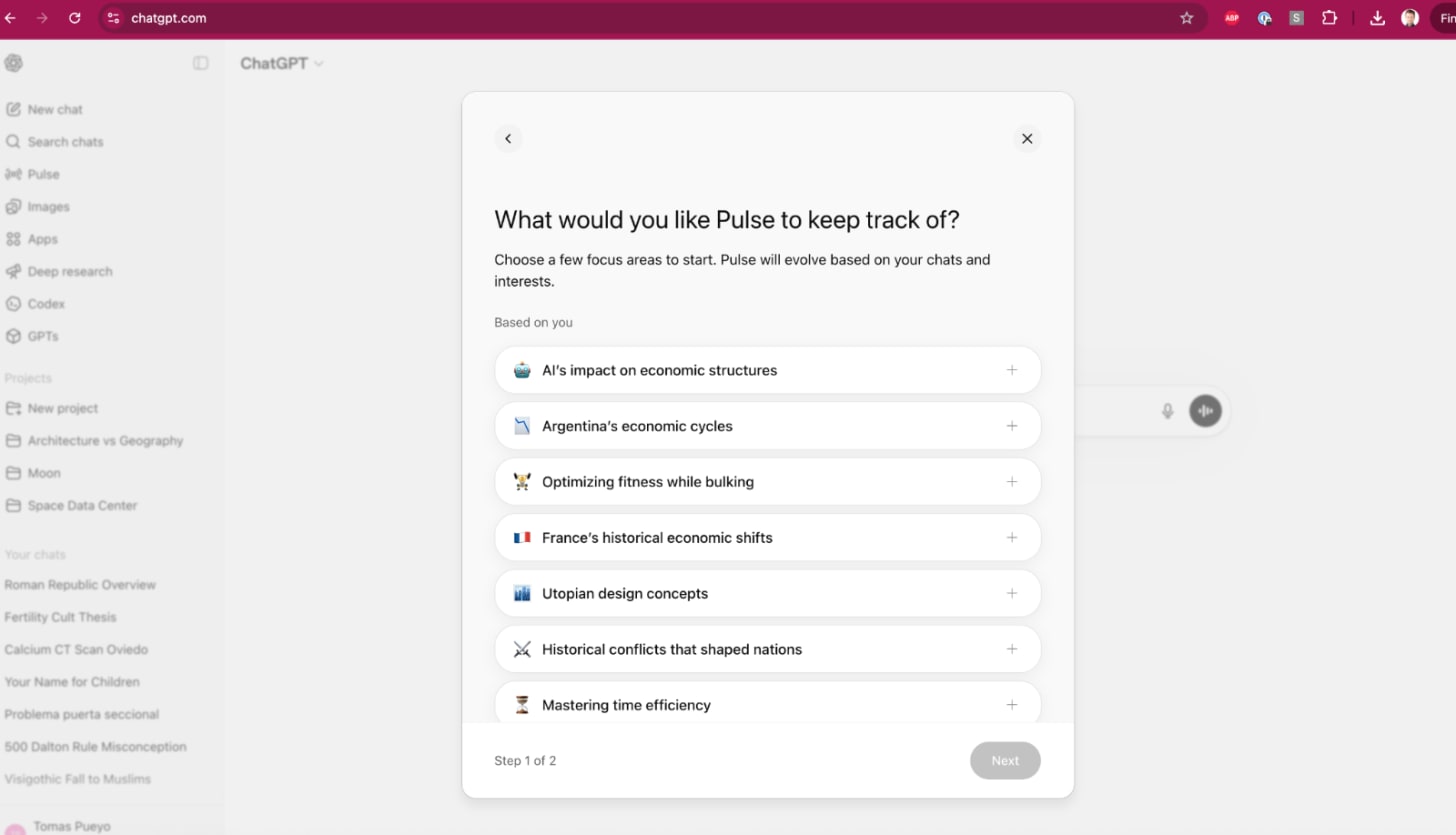 With much more supply of content and a fixed amount of attention, we’ll need better mechanisms to digest information, like for example LLMs looking at what’s going on right now in the world and giving you a summary. This is what OpenAI is trying to do with Pulse: