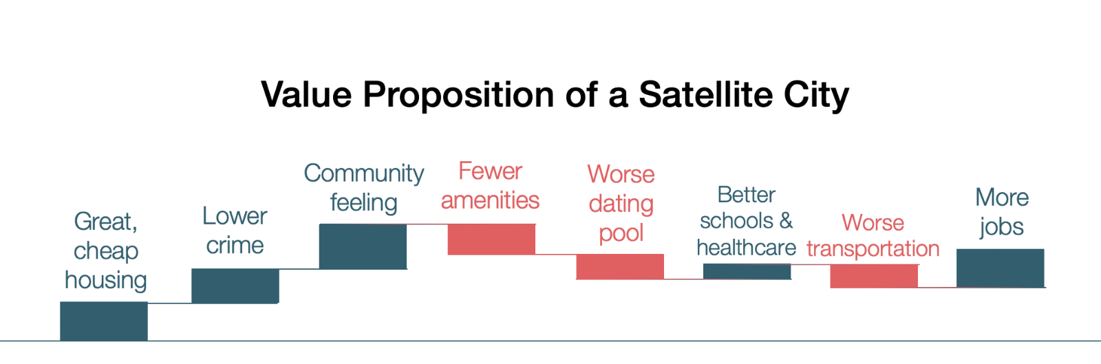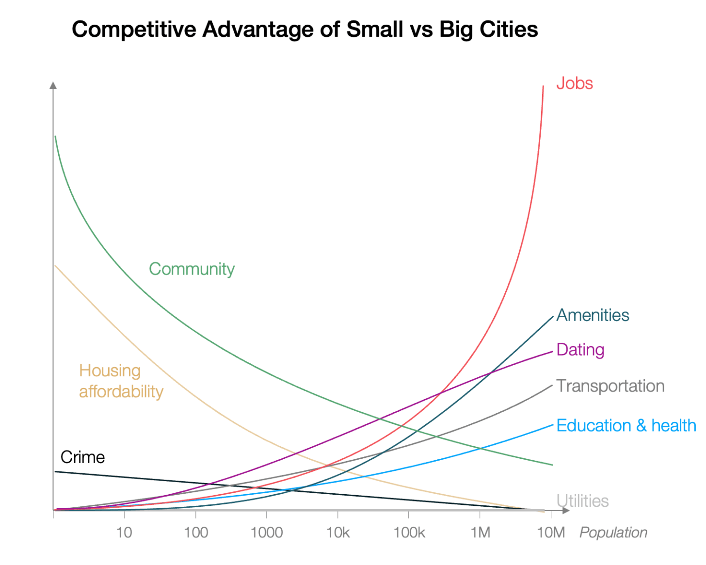 When new cities and jurisdictions are putting together their offering, they’re basically trying to weigh their competitive advantages between real estate quality & affordability, crime, the feeling of community, jobs, education, healthcare, transportation, utilities, amenities, and dating. They’re trying to do something like this: