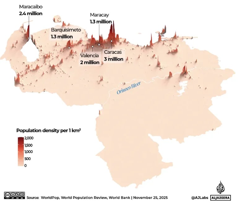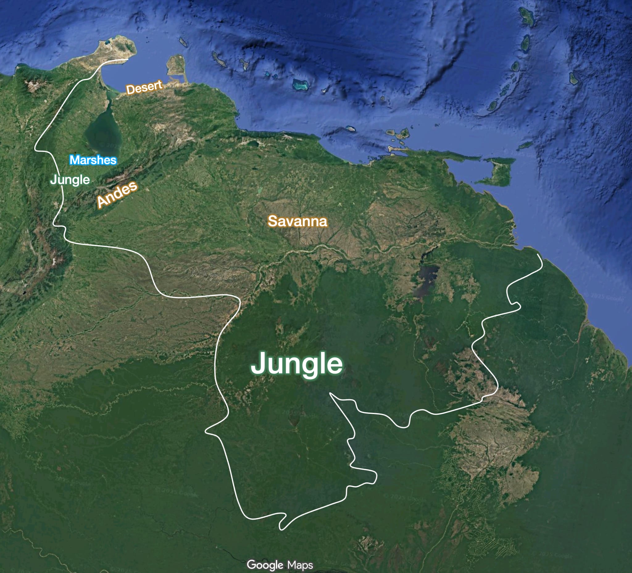 And since Venezuela is just above the equator, half of it is covered by jungle. Here’s a satellite map: