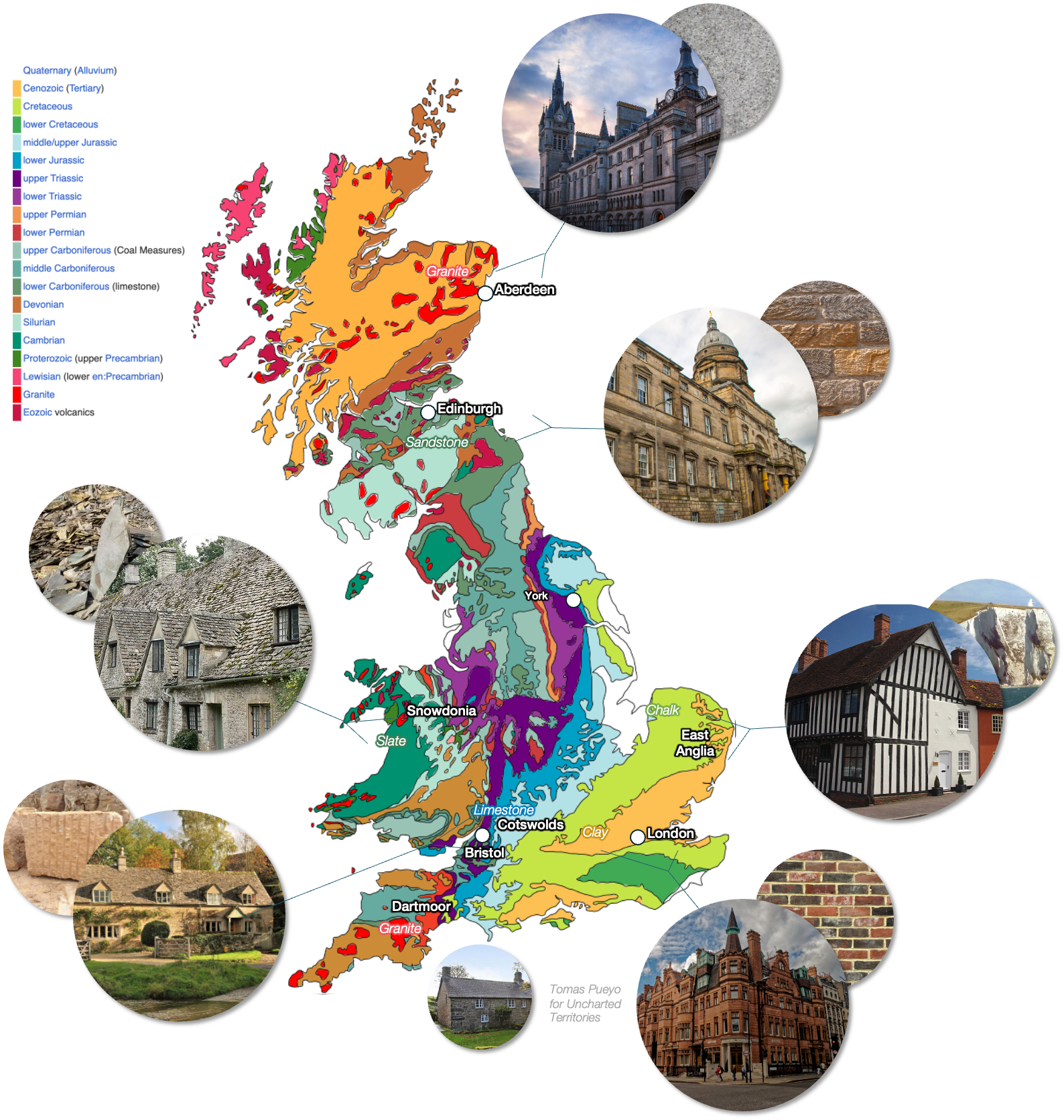 Aberdeen is famous for its dark granite. We can also find granite in southwest England around Dartmoor, and sure enough, there, homes tend to be made of granite. Edinburgh has sandstone, evident in its sand-colored buildings. Golden limestone is common around Bristol, and old country houses are golden as a result. The soil in the surroundings of London is the result of sediment accumulation, so there’s much less stone to go around. But there’s clay, which can be made into bricks. Sure enough, London is full of brick buildings. The chalk in South and East England is too brittle for walls, but use timber frames, fill the wall with twigs, wet soil and straw, and then whitewash it with a solution made with chalk, and these homes can last centuries if well maintained. For the roof, use thatch.