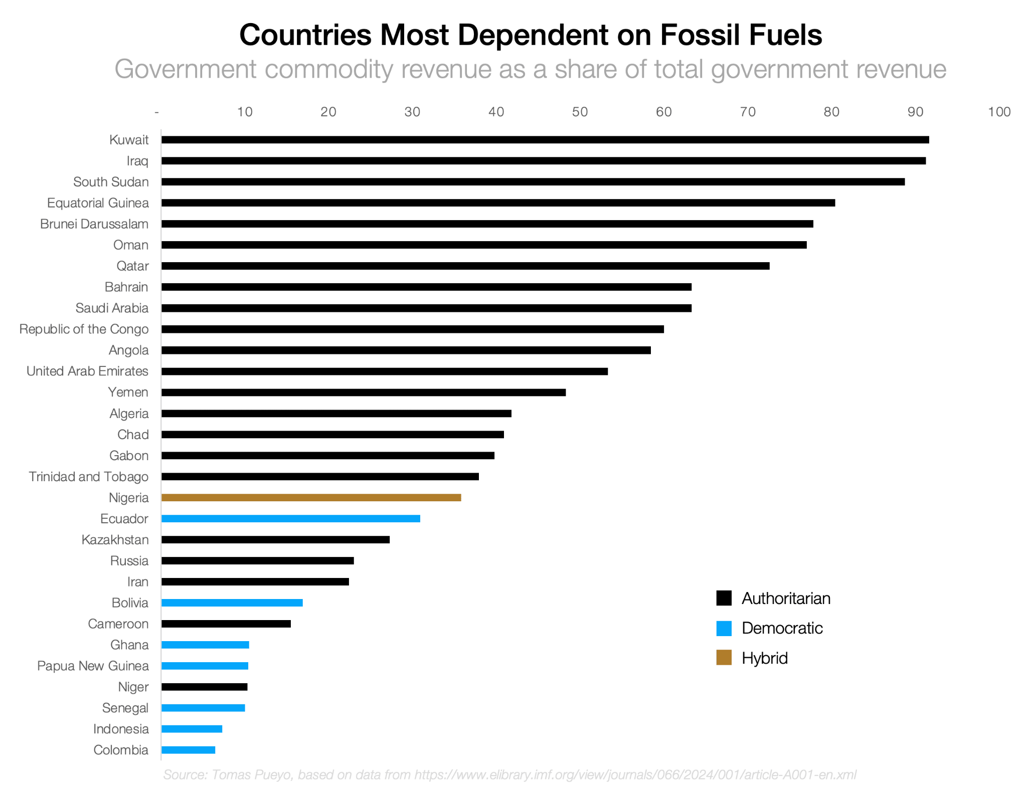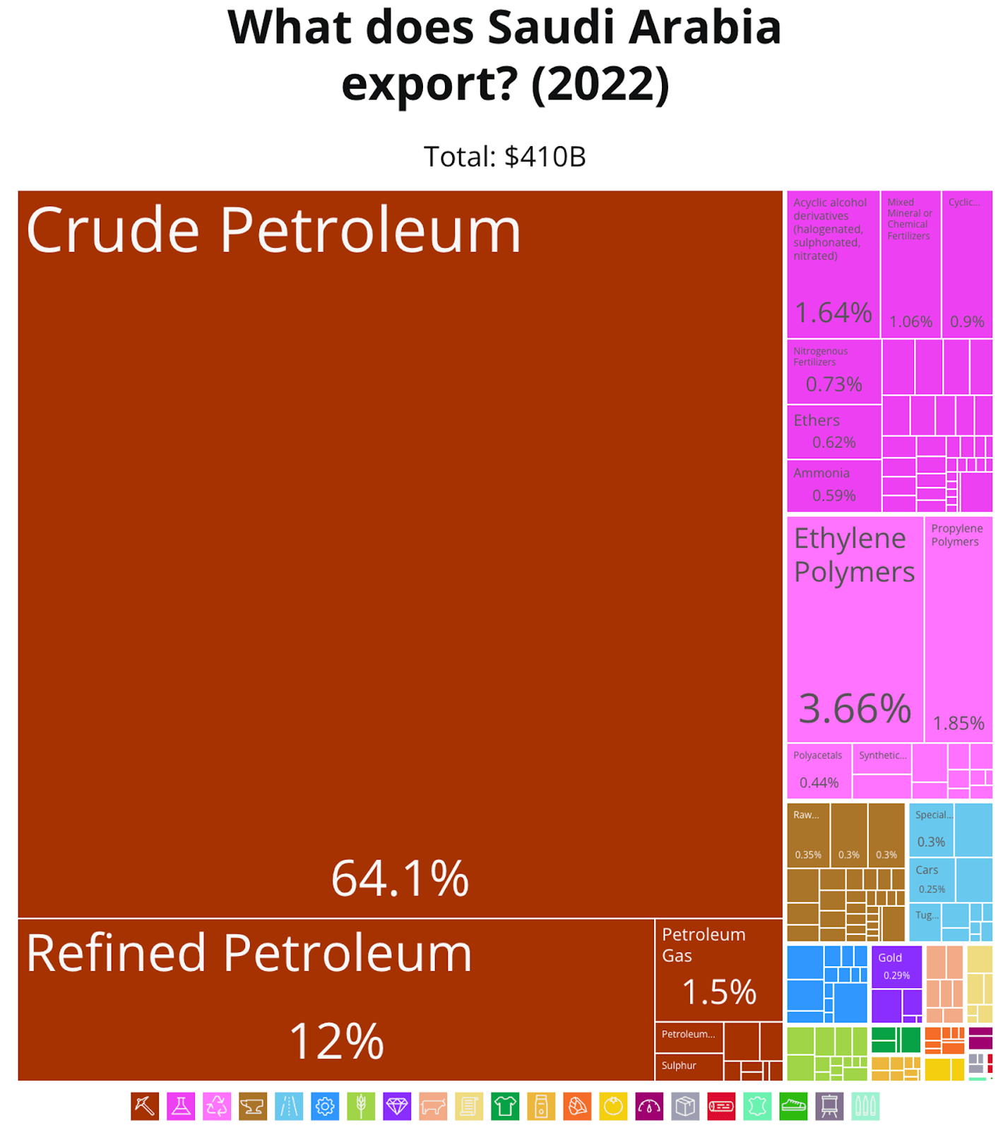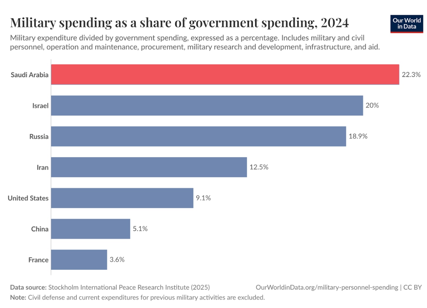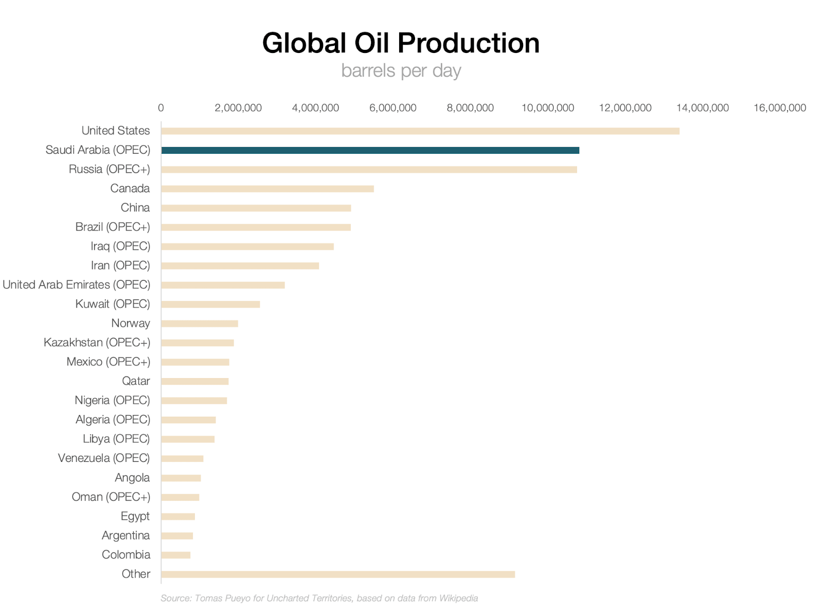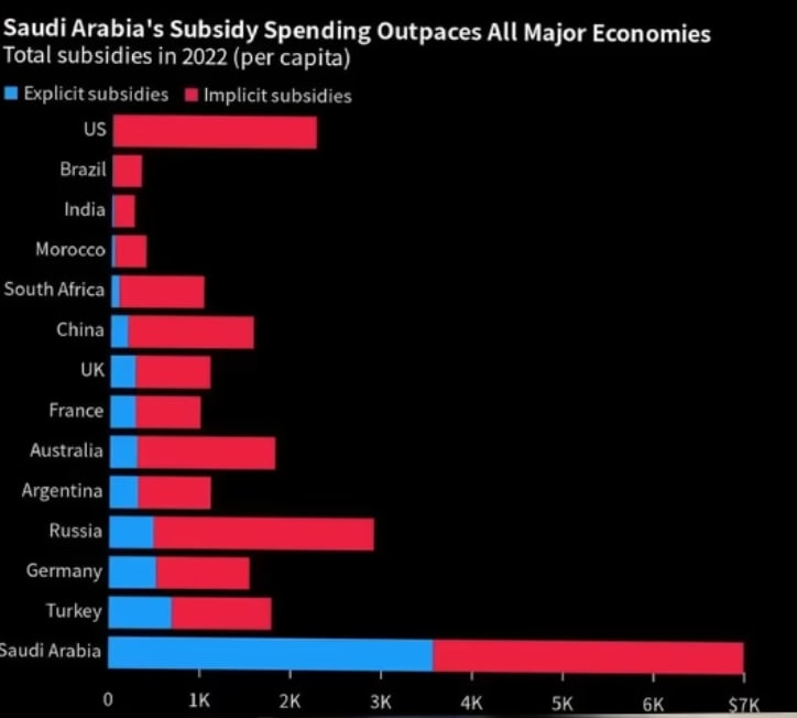 The figure is actually hard to get, I assume because of course the government wants to sandbag it. Official figures suggest ~60% of income from oil, but they’re breaking down the oil revenue into straight income, royalties, taxes, dividends… Many of which really come from oil. Some of the income comes via the sovereign fund, the PIF, which owns part of the state oil company, Saudi Aramco. But the fact that it comes from PIF and not Saudi Aramco directly doesn’t matter. There’s also the indirect revenue: About ⅔ of Saudis work in the public sector (paid through money coming from oil!). They pay their taxes on goods and services, which apparently are 50% of non-oil taxes. But that money comes mostly from oil, via the salaries of the public servants! That’s ~17% more government income directly attributable to oil. This is why Wikipedia quotes ~75% as the figure. My guess is the true revenue is probably higher than 80%, but my point here is not to be precise, it’s to convey the idea that the government is terribly dependent on oil, and this is enough for that.