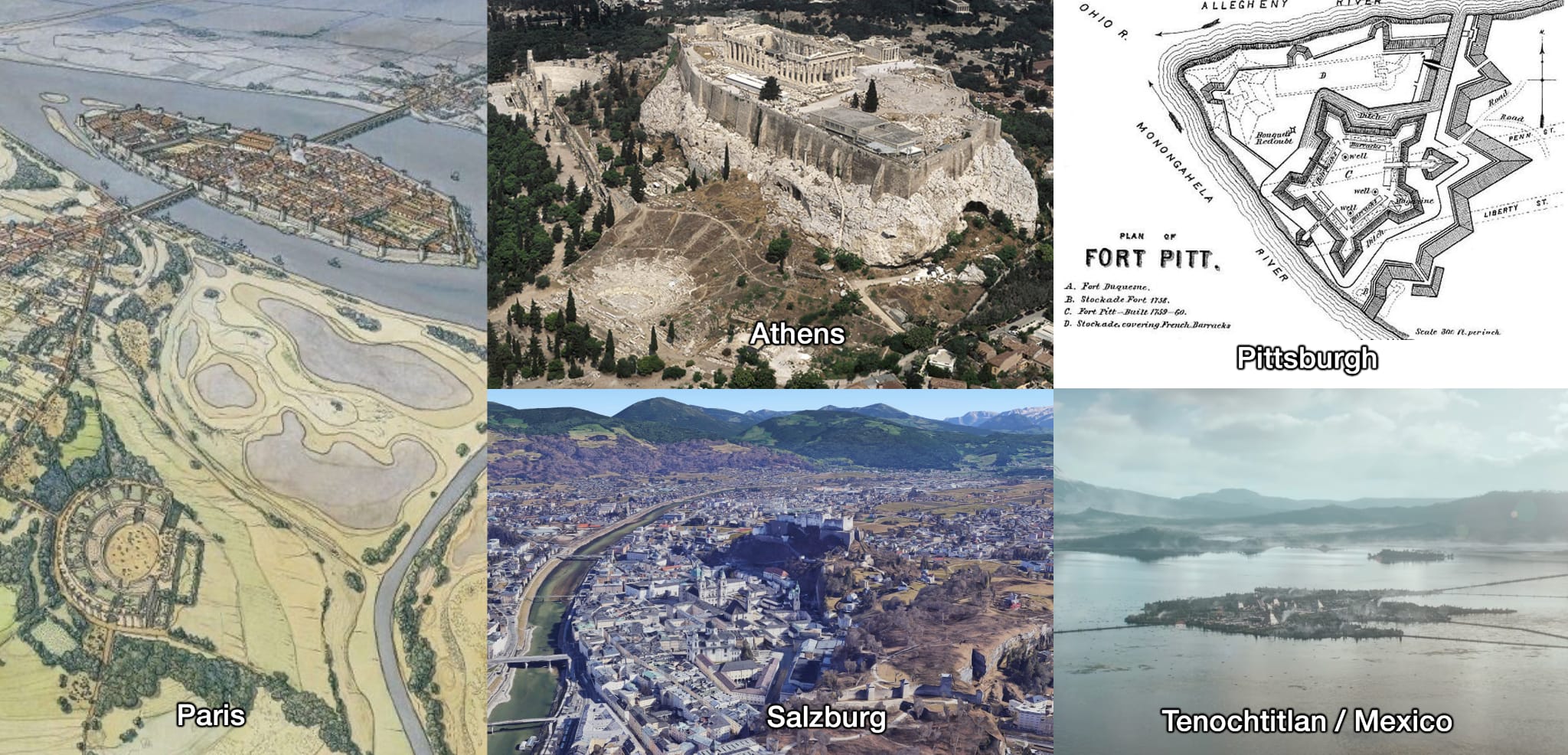 London was on a hill on the Thames. Other cities along a river with a fort on a hill include Athens, Carcassonne, Salzburg, Budapest, Prague…