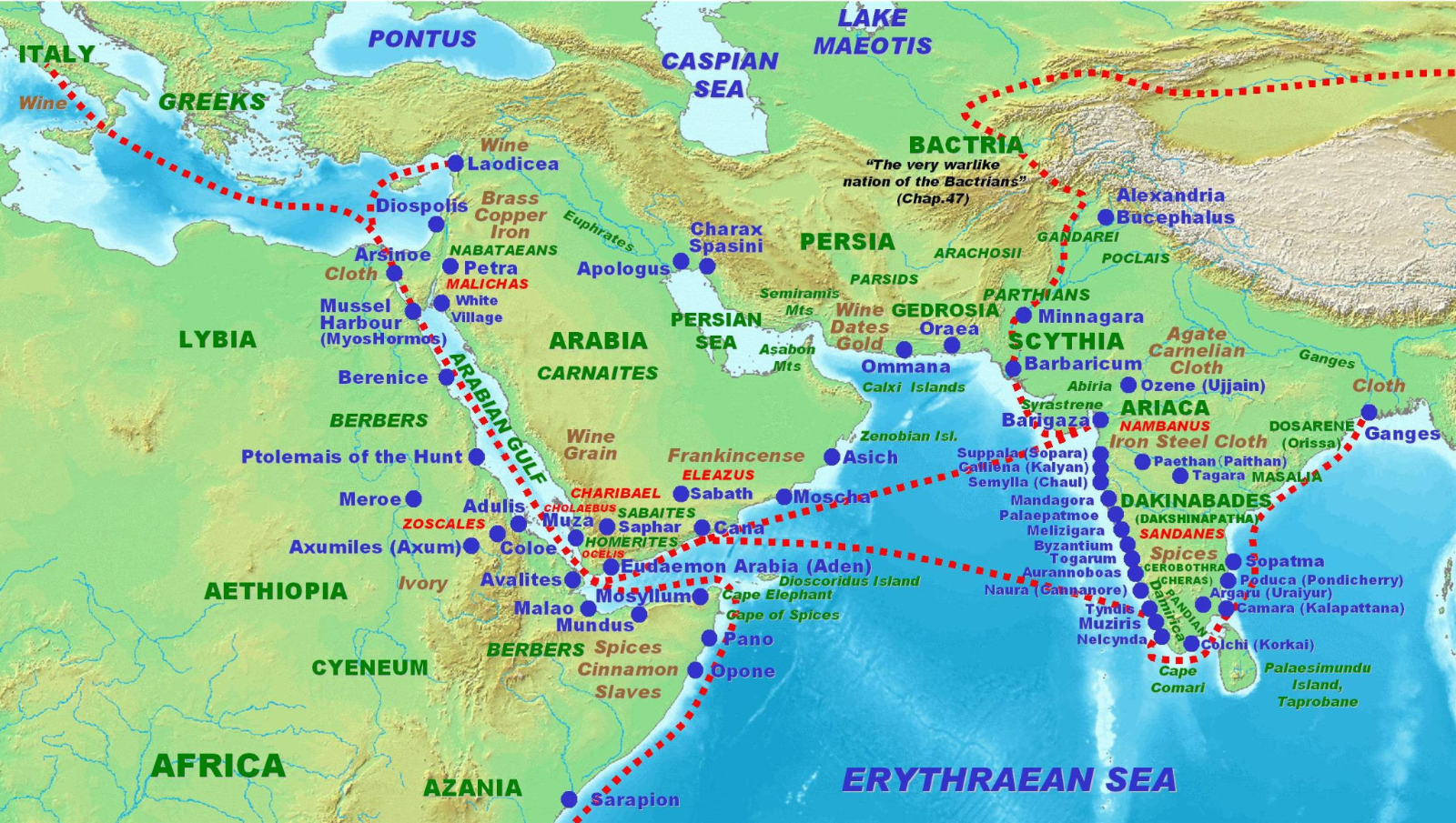 Notice on the trade map above that there were no stops between Yemen and the Mediterranean on the Arabian coast. That’s how awfully dry that region is: not even port settlements could survive.