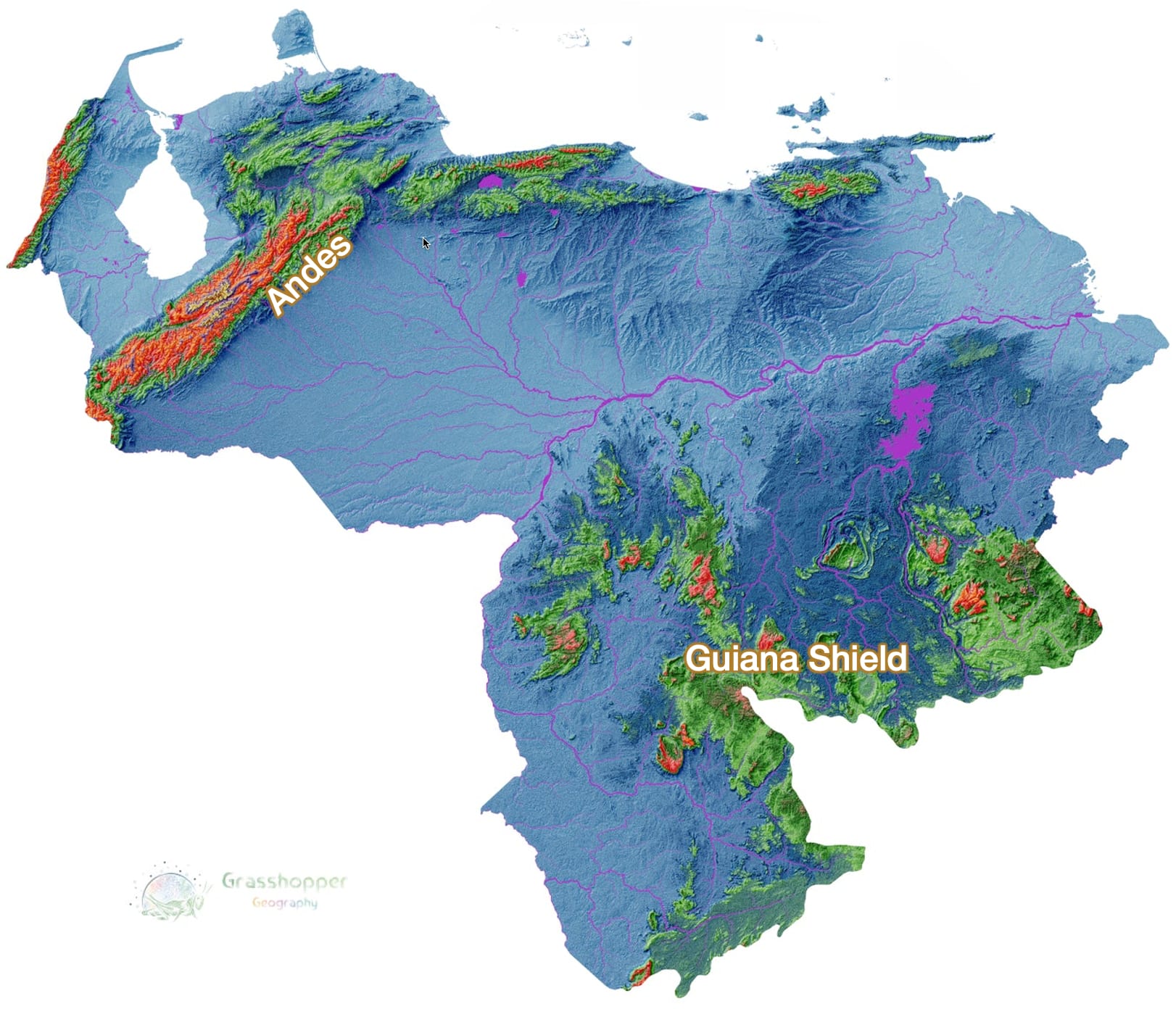 Venezuela is mostly flat, with two big mountain ranges: the Andes in the northwest (extending up the north coast), and the Guiana Shield in the southeast. That shield is where you can find the famous Tepuis: