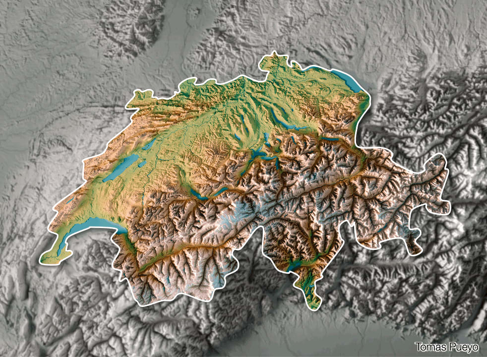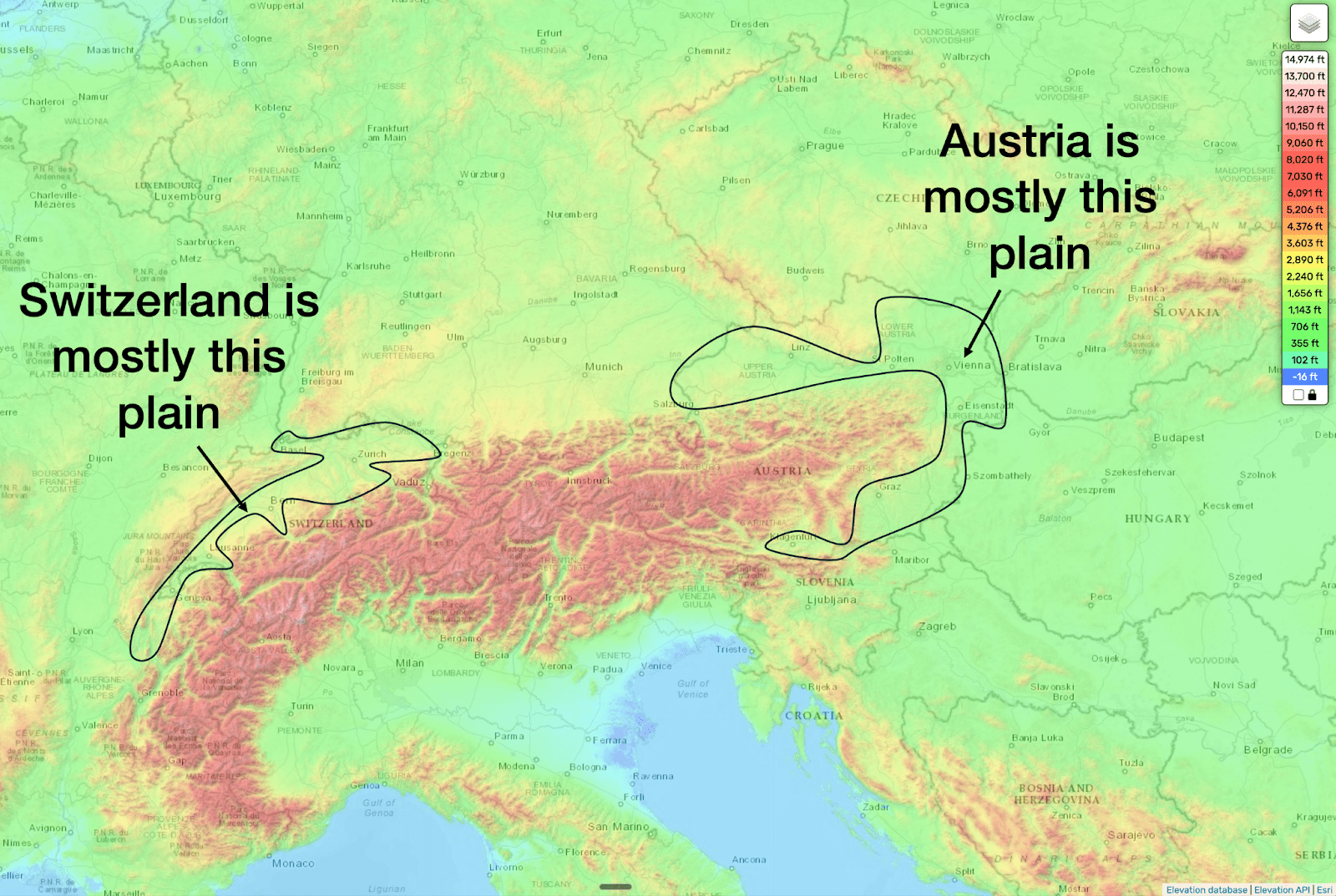 Compare this with the Himalayas: The Nepalese capital Kathmandu is at 1,500 m / 4,500 ft, and it’s surrounded by mountains that peak at 2800 m / 8500 ft. To its north, the range reaches 8,800 m / 29,000 ft, and then has thousands of square kilometers of Tibet, which is ~4,500 m / 14,000 ft high. On one side it has poor India, on the other it has what was until recently poor China. In other words, if you put Switzerland in the Himalayas, it would be poor.