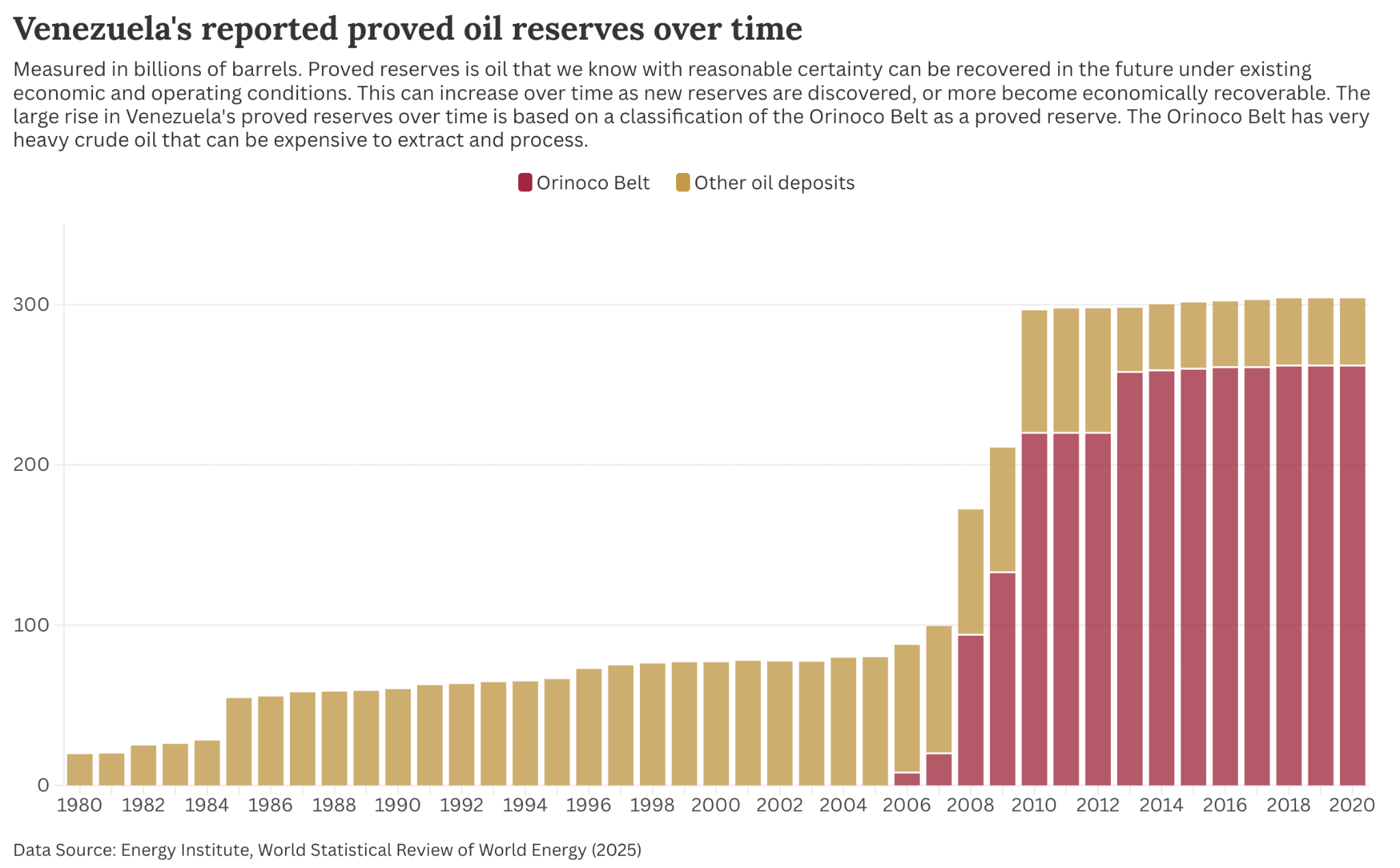 There are a few reserves in Lake Maracaibo to the northwest, and more in the Orinoco Valley. The vast majority of these reserves is in the Orinoco Valley, and their discovery is reasonably recent.