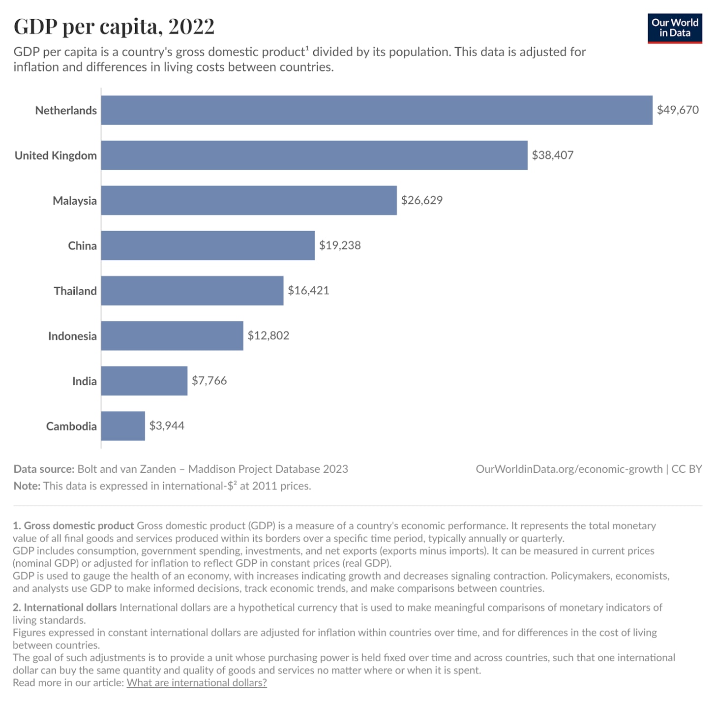 I looked at the very long term GDP per capita for these countries, plus the Netherlands and the UK. There’s not much data, but around 1850 it was ~$800 in the region ($724 for Indonesia, $860 for China, $950 for India). At that time, it was 4-5x higher in the UK and NL. In the year 1000, the UK was already richer ($1,000) than this region in 1850. Data for the Netherlands starts in 1350, at $1,400. And this is all before these regions started really accumulating wealth, which is the point of the article! Europe went down for 500 years after the fall of the Roman Empire (the Dark Ages lasted broadly from 500 AD to 1000 AD), and the Agricultural Revolution that exploded the population in Europe started around 1000 AD. Technology slowly built up from 1000 AD to 1800 AD, with an explosion afterwards. These are the critical years, and I argue that this tech and wealth explosion was hard in warm regions for the reasons I shared in the previous article.