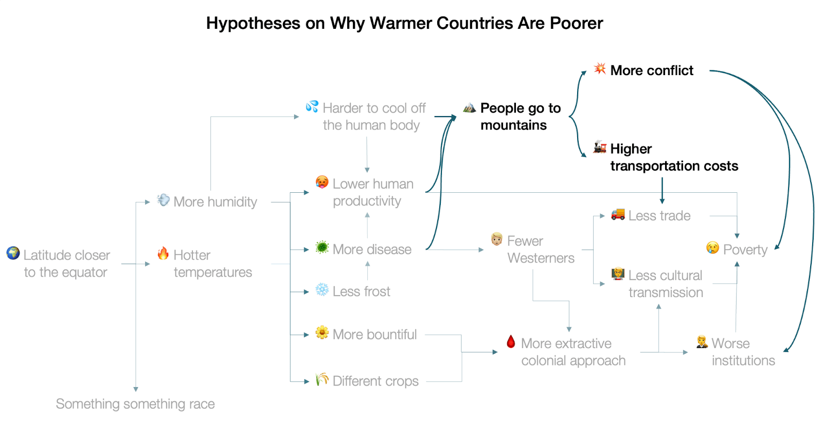 So just to clarify: The problem is not the presence of mountains. The problem is if mountains make transportation difficult. In northern regions, usually, people might establish themselves at the feet of mountains, because they’re going to get access to mountain mining plus river transportation. Meanwhile, in equatorial countries, people will live among the mountains themselves, because there the elevation is a plus, not a minus, for cooler temperatures, less disease etc. The trade-off is that it makes transportation much more expensive and conflict.
