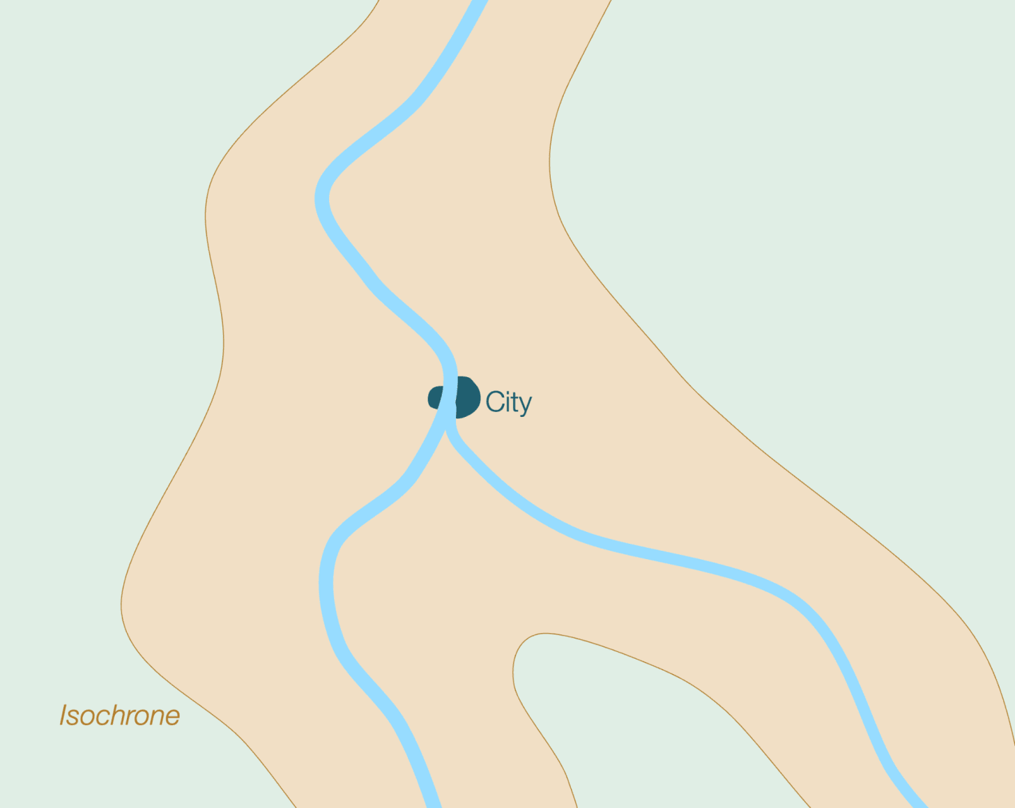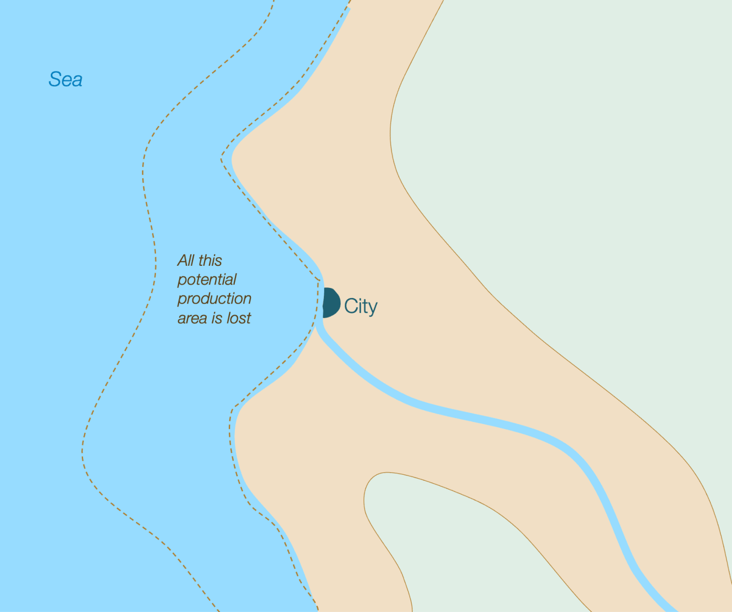 So the ideal city is a village that happens to be on the confluence of several calm, navigable rivers, on an estuary close to the coast, with a ford to cross the rivers, and near a natural road that connects important points.