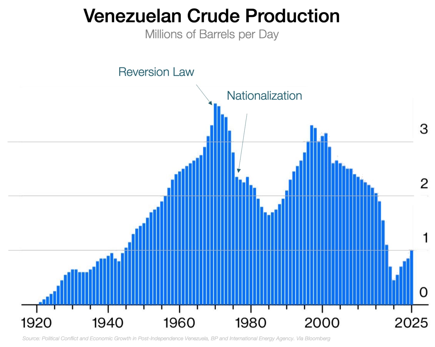 It’s worth stopping here for a second. Between the 1970 peak and the trough in the 1980s, Venezuela reduced production by about 2M barrels per day, worth $200B today.