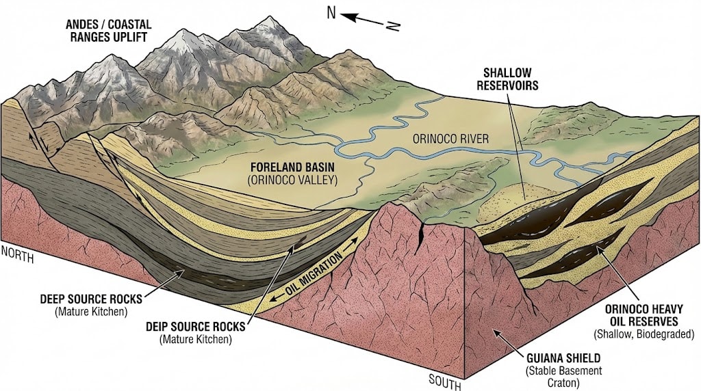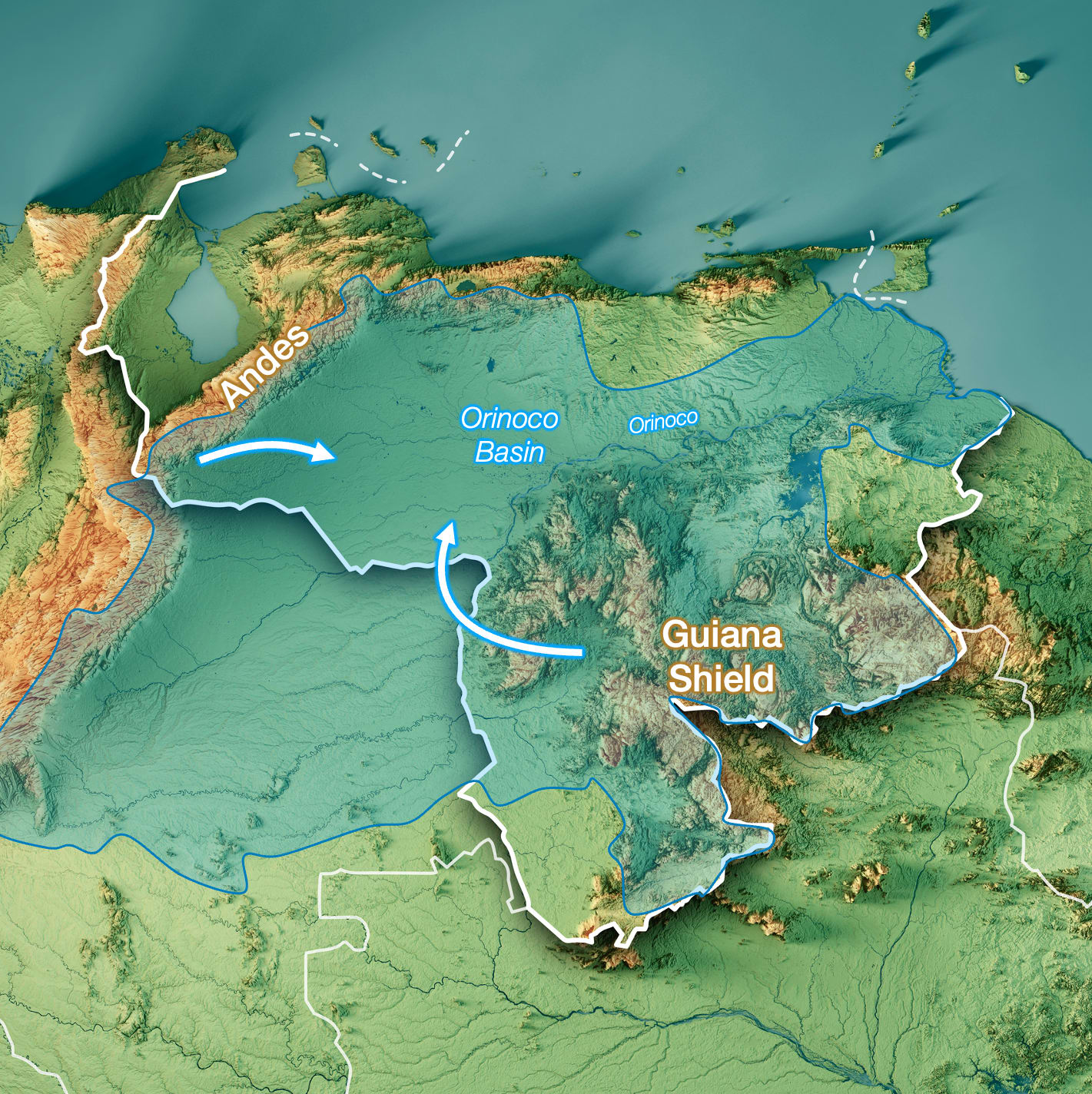 But how did the Orinoco oil fields become the biggest oil reserve in the world? As the Pacific and Caribbean Plates hit the South American Plate, mountains rose, and the oil basically flowed southeastward until it hit the Guiana Shield.