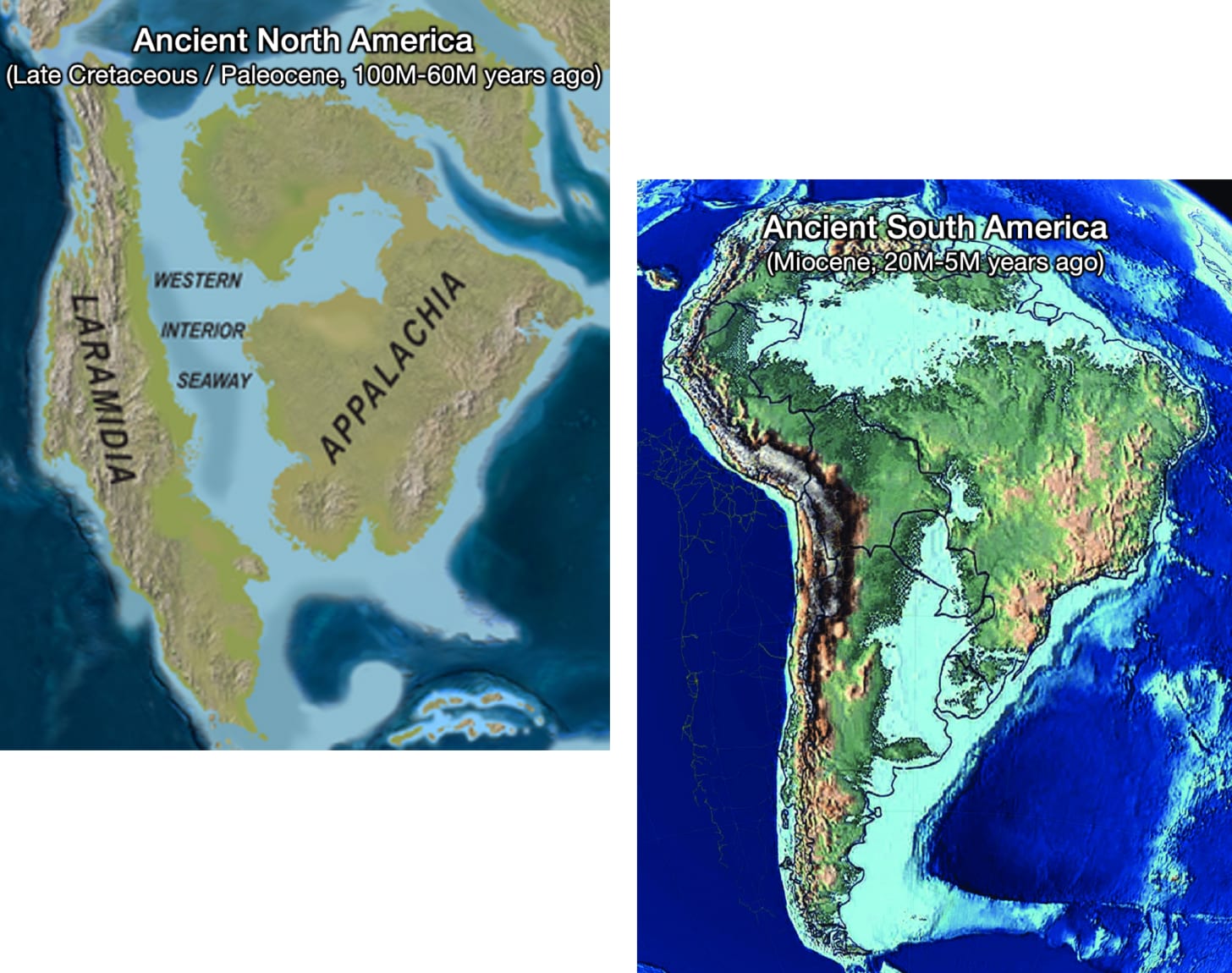 Meanwhile, to the east, the Appalachians, the Canadian Shield, the Brazilian Shield, and Africa used to be part of the same ancient continent!