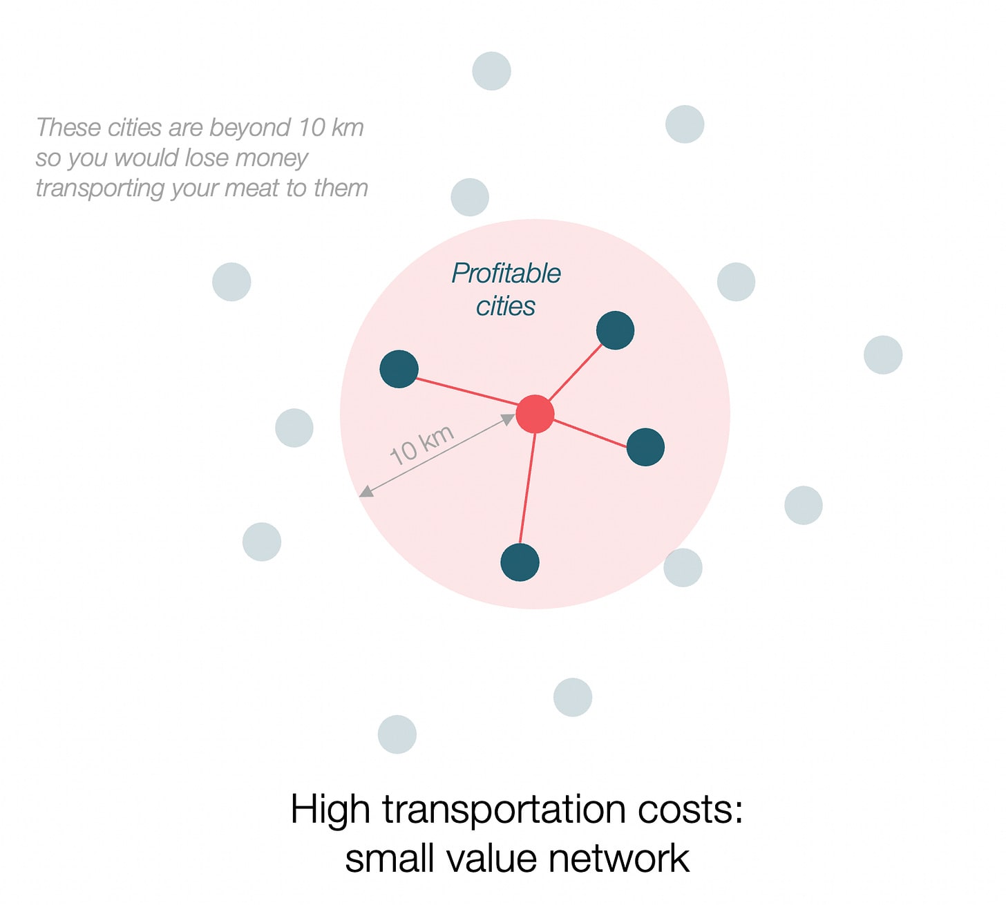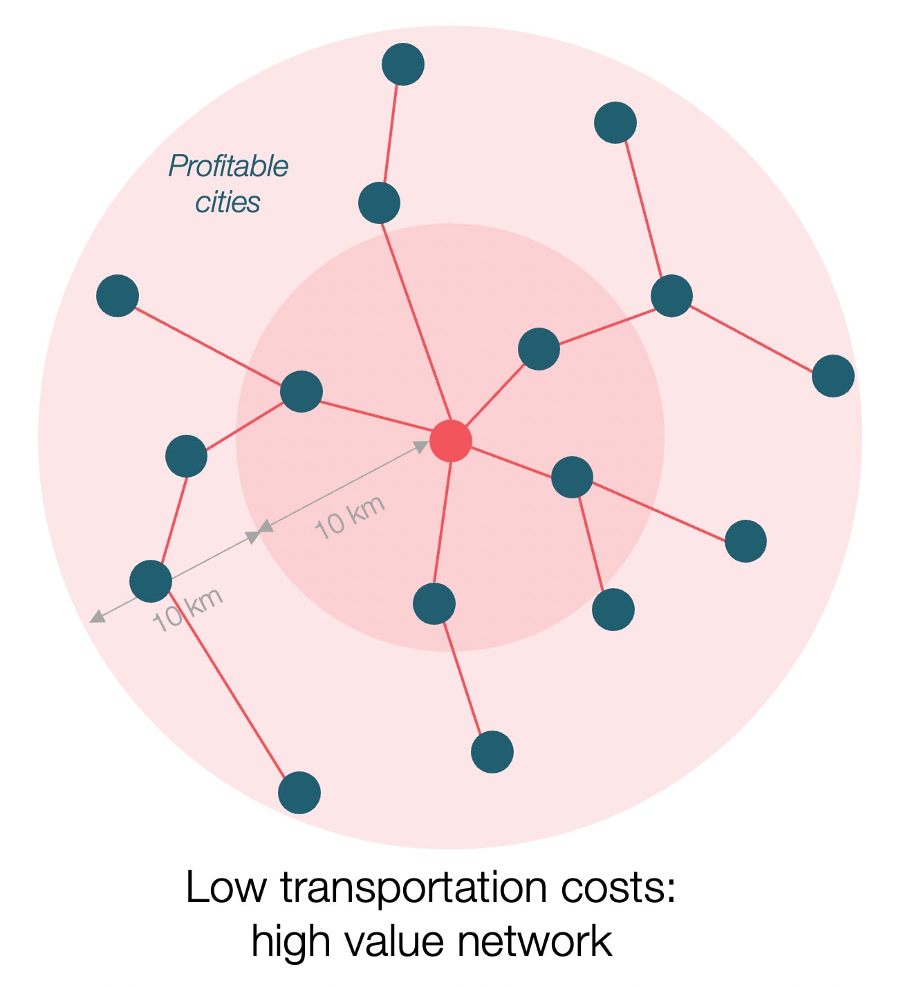 If instead, your cost of transportation is half of that, what happens? It costs you $0.5 per km. Now you’re increasing your margins with each of the cities that you trade with. But more importantly, now you can reach markets that are 20 km away.